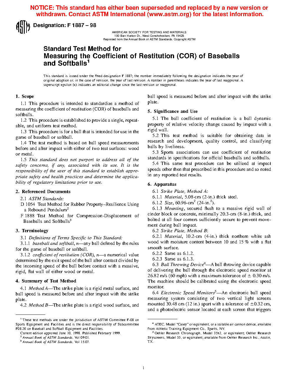 1.1 This procedure is intended to standardize a method of measuring the coefficient of restitution (COR) of baseballs and softballs.