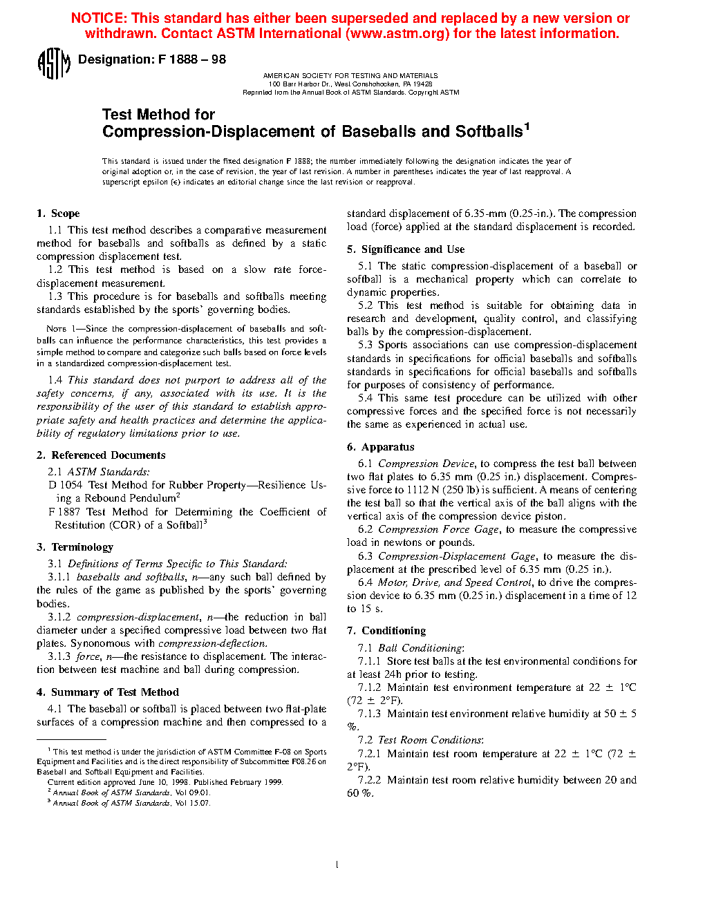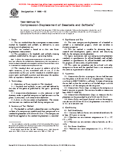 1.1 This test method describes a comparative measurement method for baseballs and softballs as defined by a static compression displacement test.