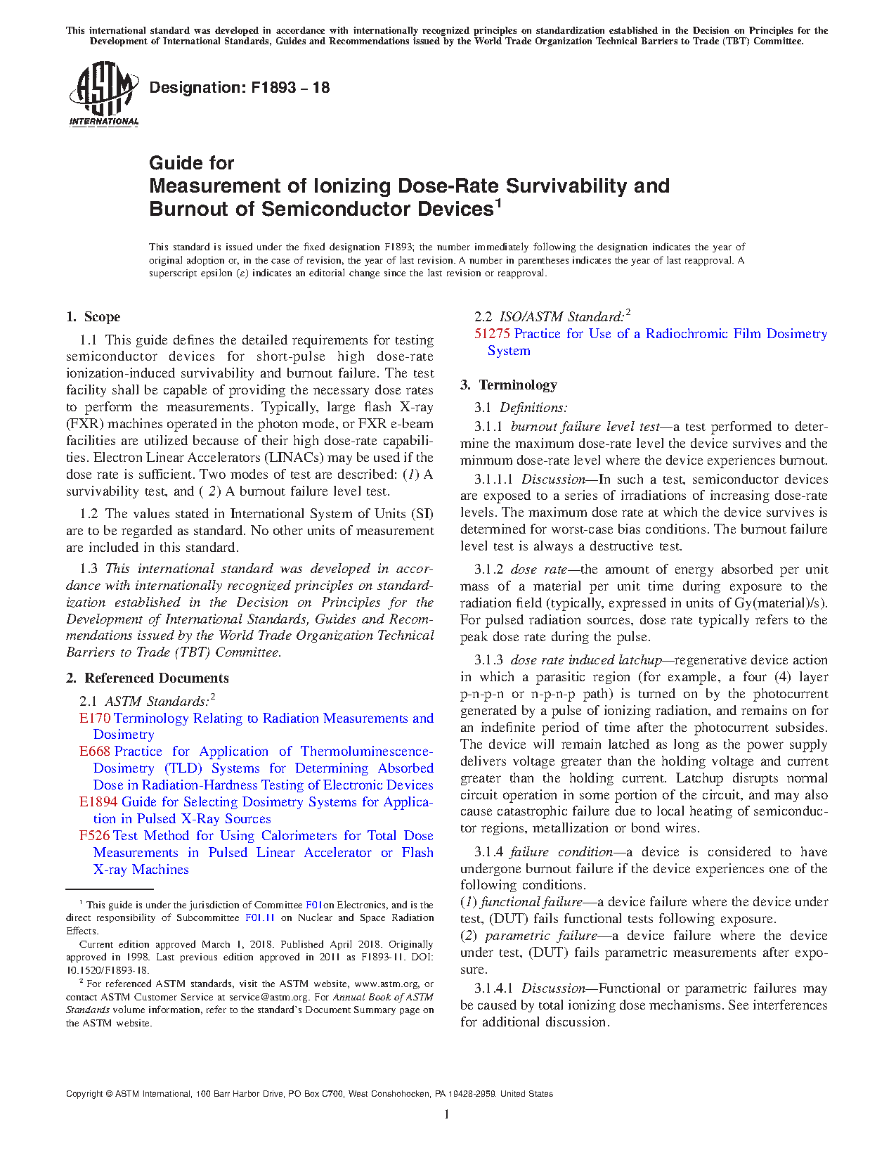 1.1 This guide defines the detailed requirements for testing microcircuits for short pulse high dose-rate ionization-induced failure. Large flash x-ray (FXR) machines operated in the photon mode, or FXR e-beam facilities are required because of the high dose-rate levels that are necessary to cause burnout. Two modes of test are possible (1) survival test, and (2) A failure level test.