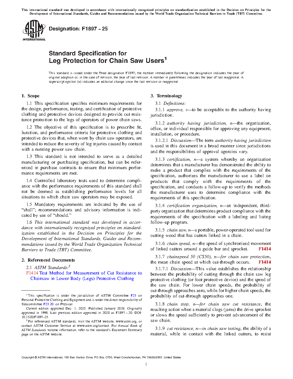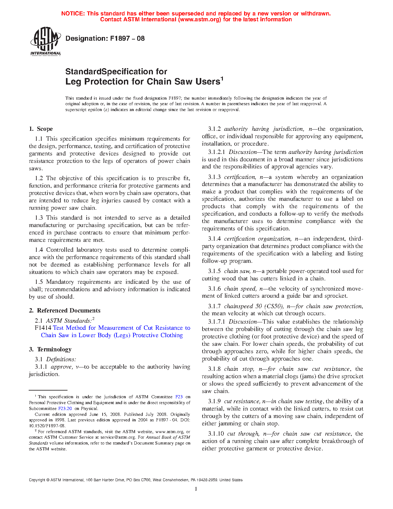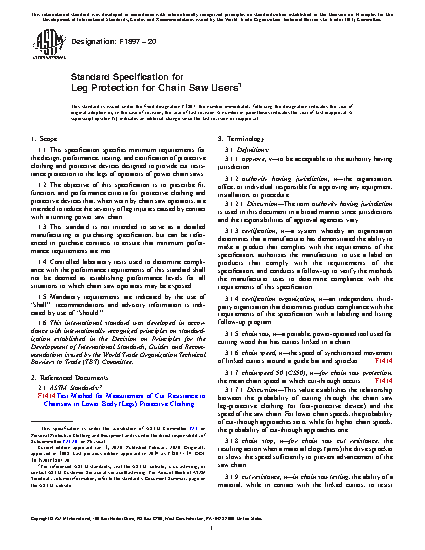 1.1 This specification specifies minimum requirements for the design, performance, testing, and certification of protective clothing and protective devices designed to provide cut resistance protection to the legs of operators of power chain saws.