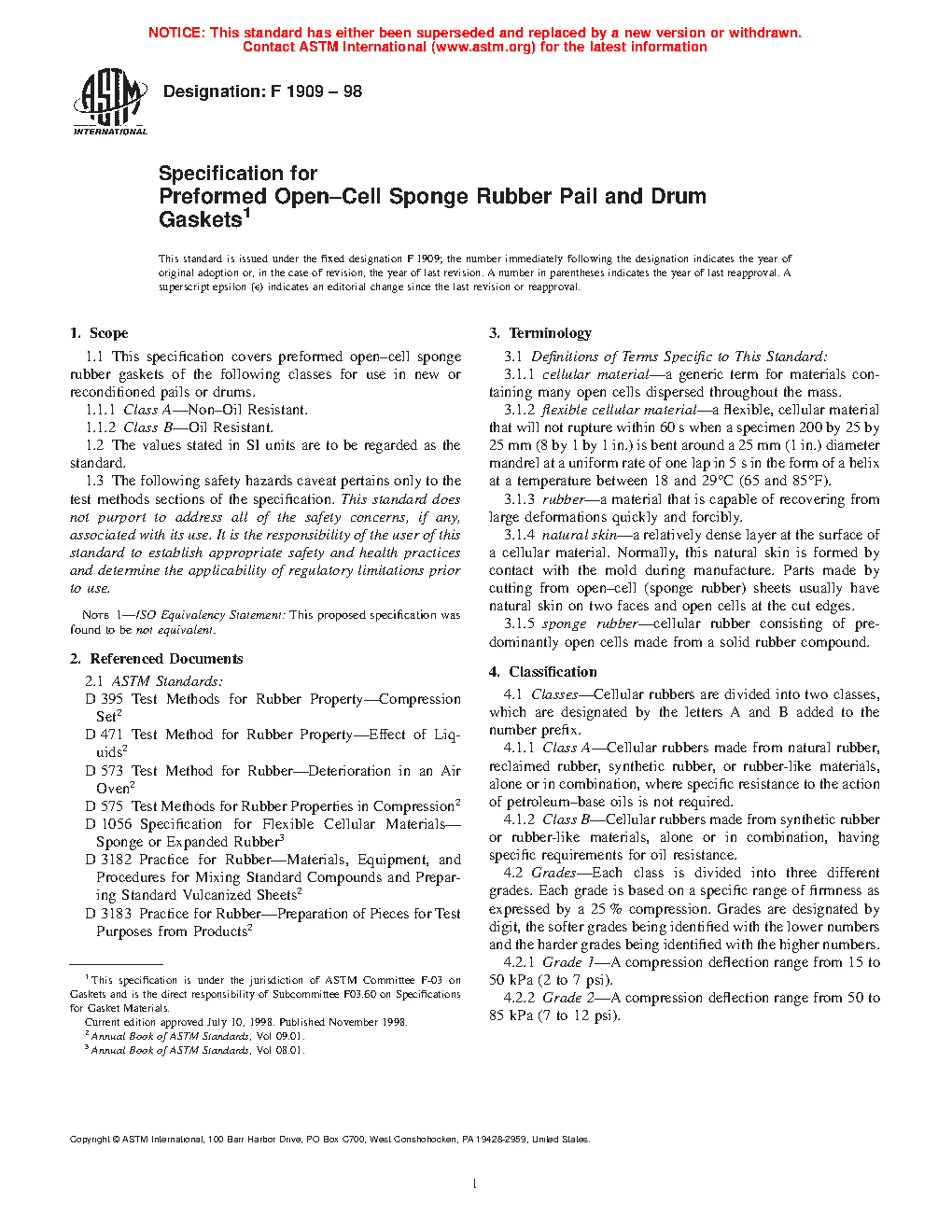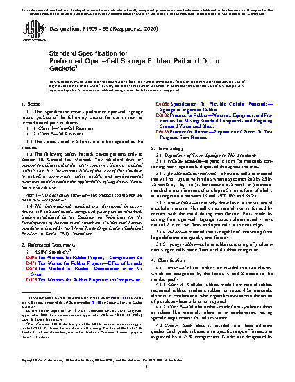 1.1 This specification covers preformed open–cell sponge rubber gaskets of the following classes for use in new or reconditioned pails or drums.