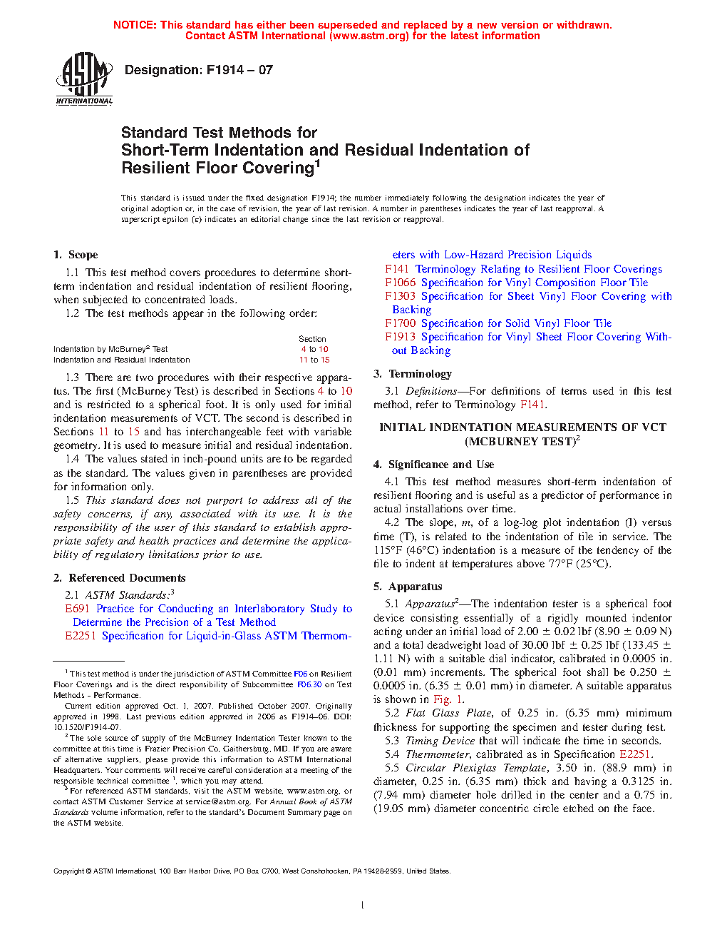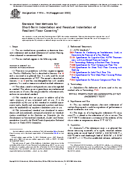 1.1 This test method covers procedures to determine short-term indentation and residual indentation of resilient flooring, when subjected to concentrated loads.