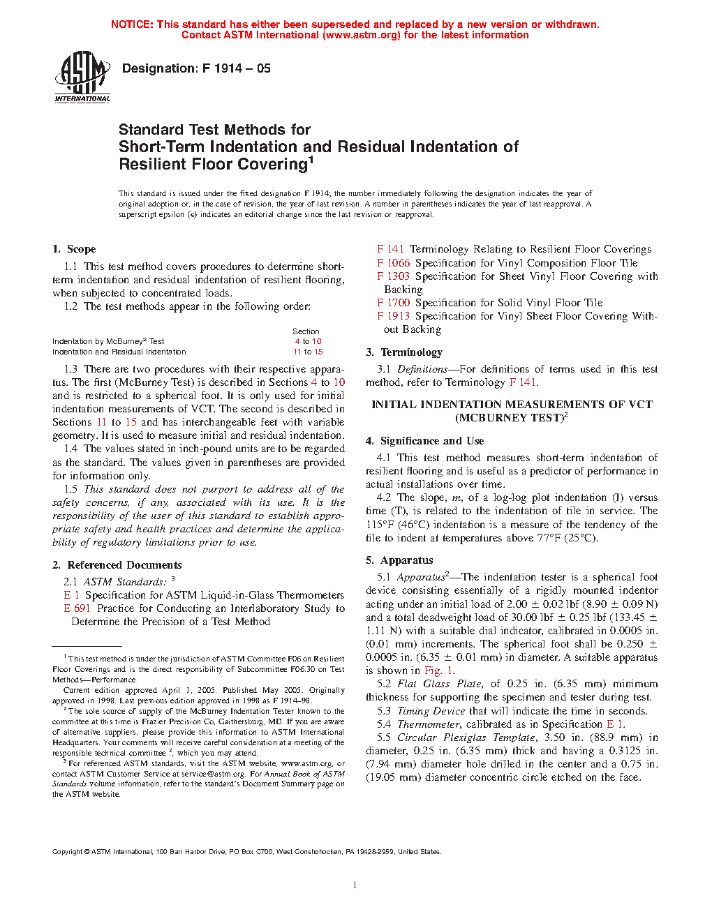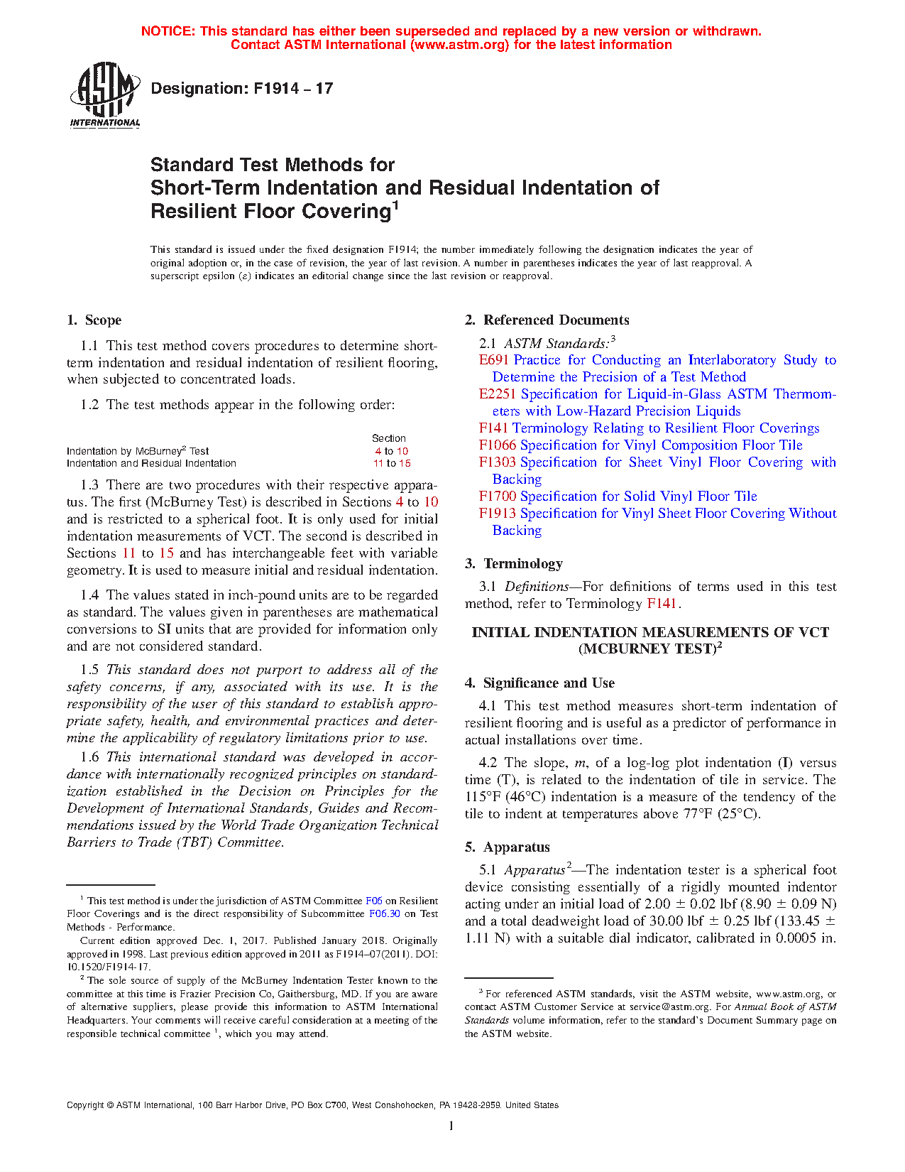1.3 There are two procedures with their respective apparatus. The first (McBurney Test) is described in Sections 4 to 10 and is restricted to a spherical foot. It is only used for initial indentation measurements of VCT. The second is described in Sections 11 to 15 and has interchangeable feet with variable geometry. It is used to measure initial and residual indentation.