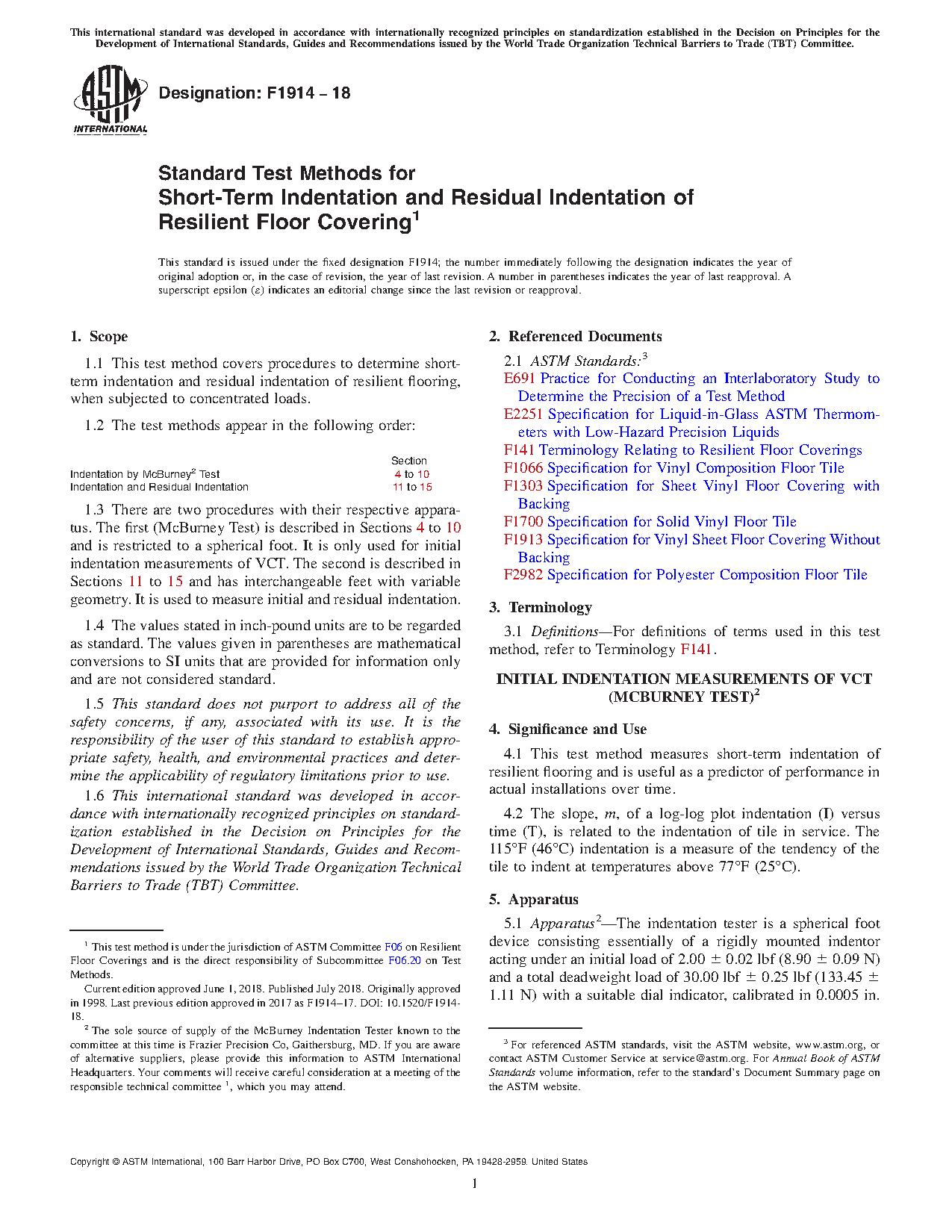 The indentation and the residual indentation of resilient floor covering is important since the resistance and recovery from indentation reflects on the ability of the resilient floor covering to perform properly after installation.