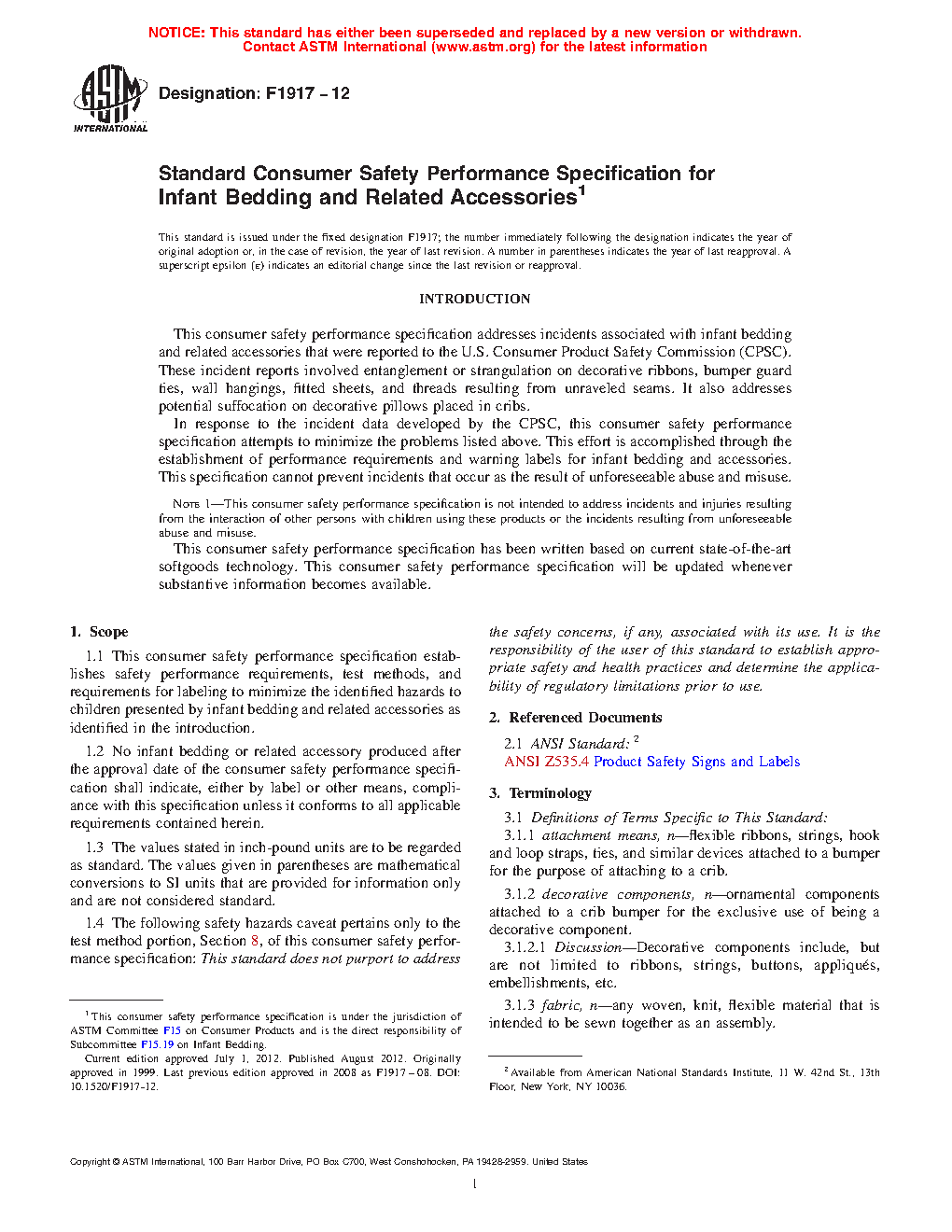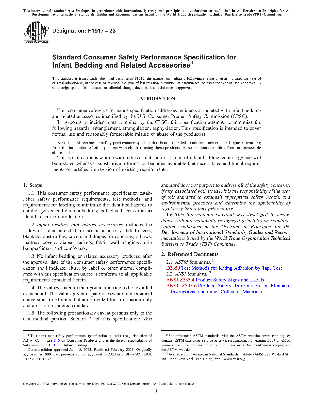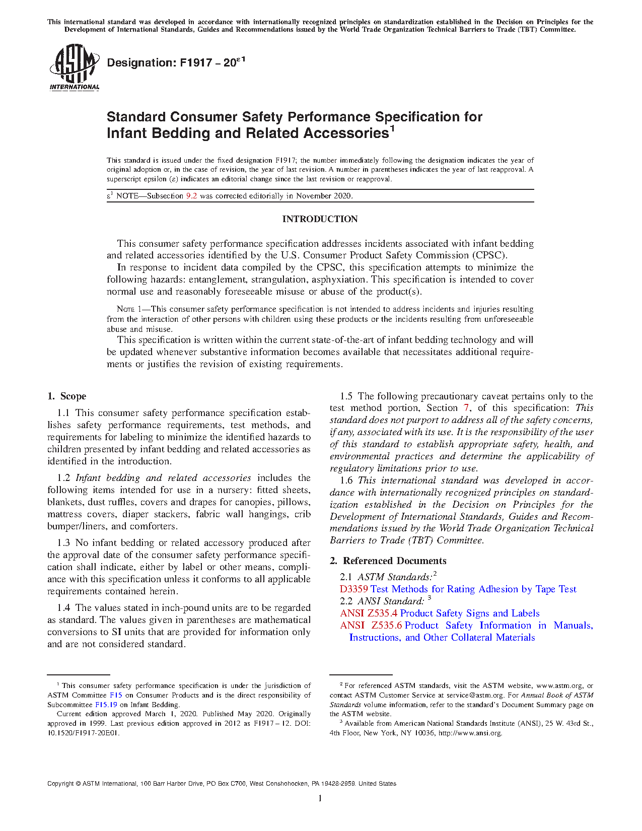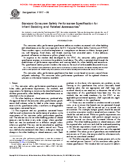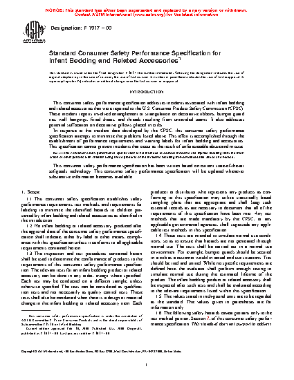 1.1 This consumer safety specification establishes safety performance requirements, test methods, and requirements for labeling to minimize the identified hazards to children presented by infant bedding and related accessories as identified in the introduction.