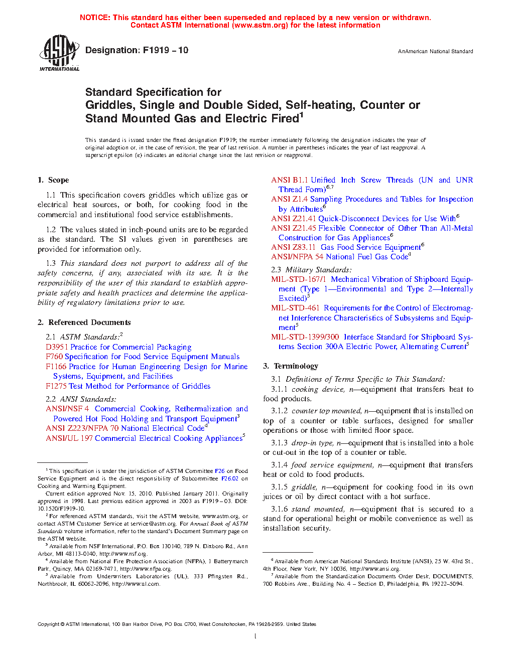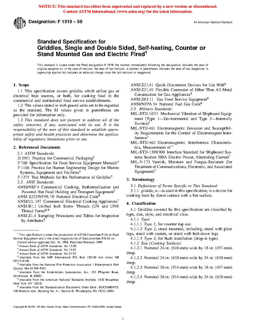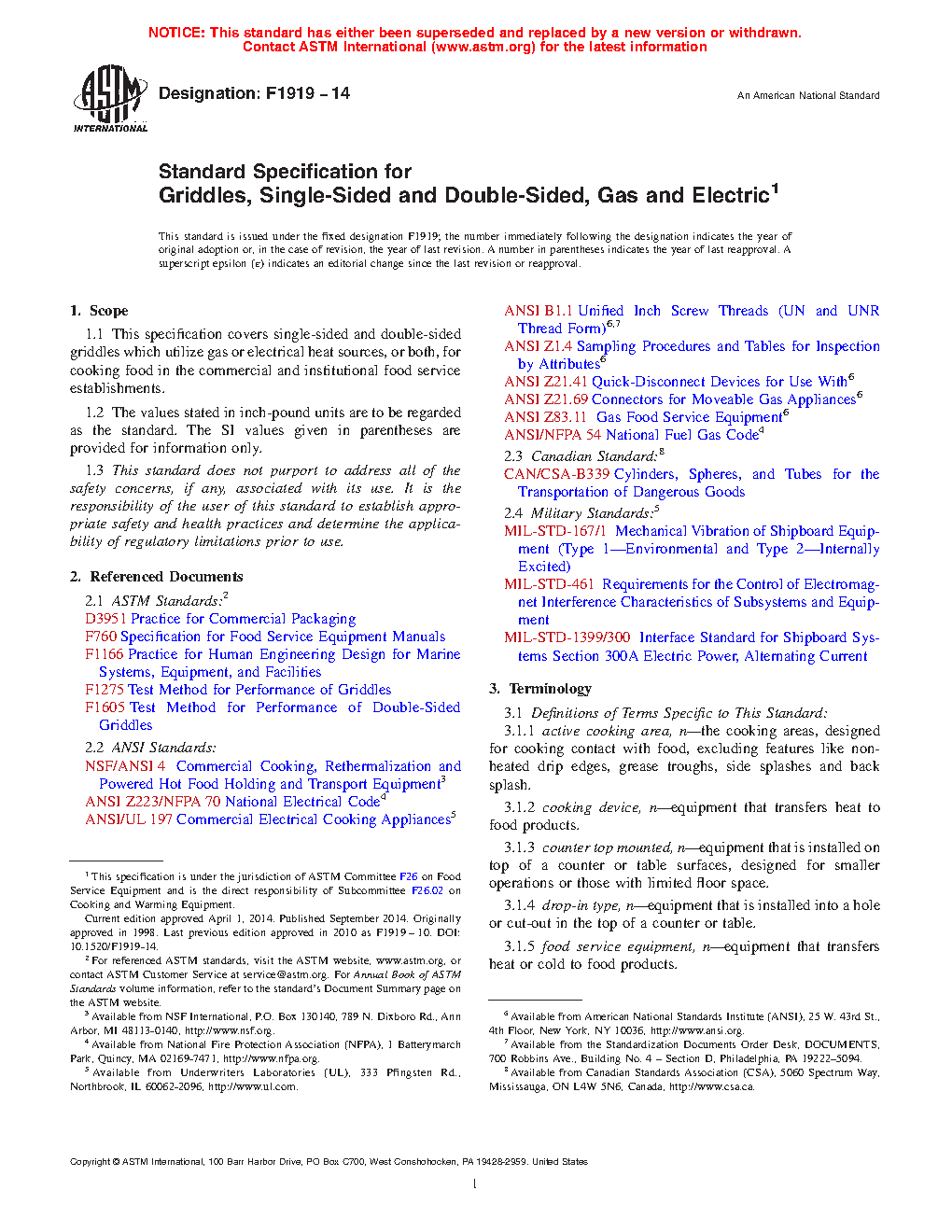 1.1 This specification covers single-sided and double-sided griddles which utilize gas or electrical heat sources, or both, for cooking food in the commercial and institutional food service establishments.