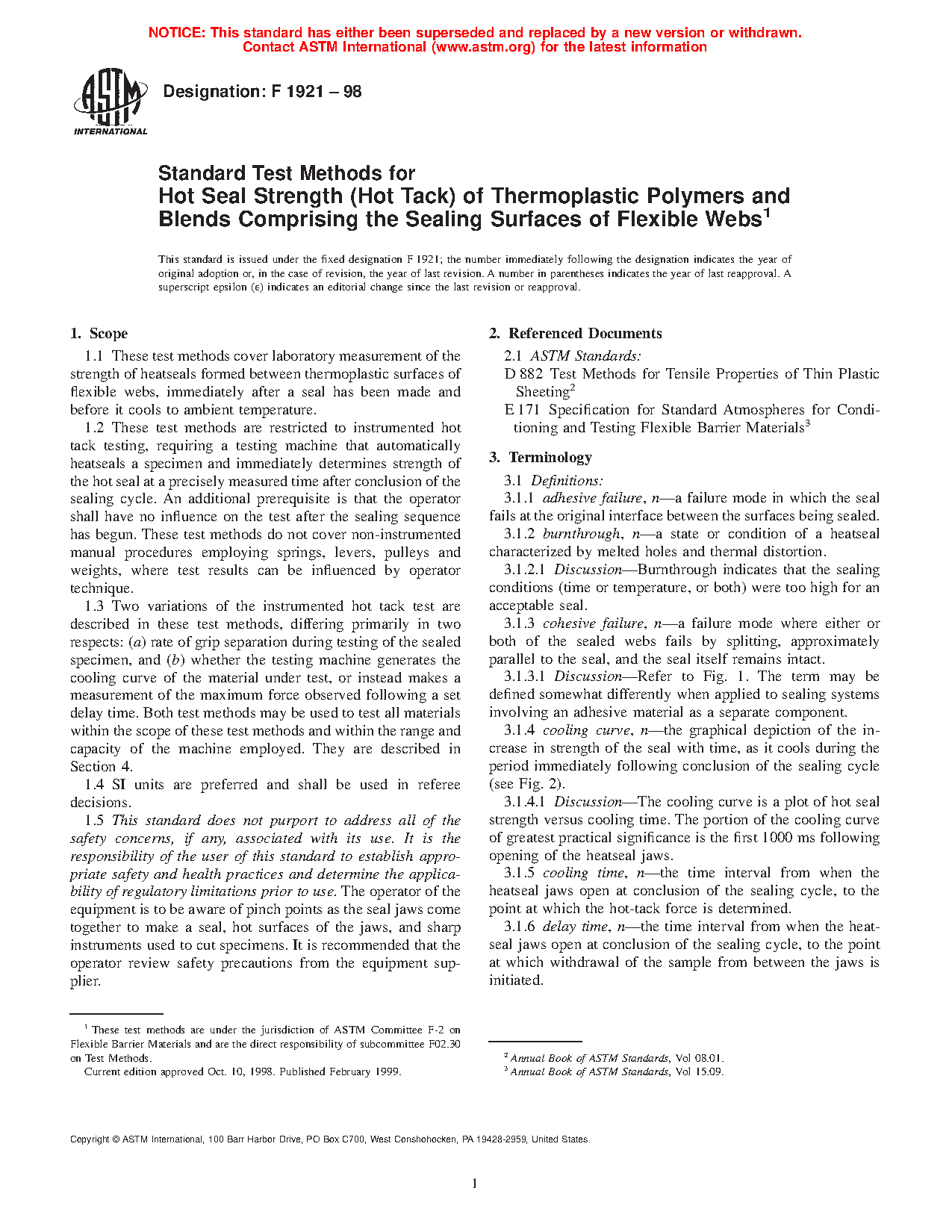 1.1 These two test methods cover laboratory measurement of the strength of heatseals formed between thermoplastic surfaces of flexible webs, immediately after a seal has been made and before it cools to ambient temperature (hot tack strength).