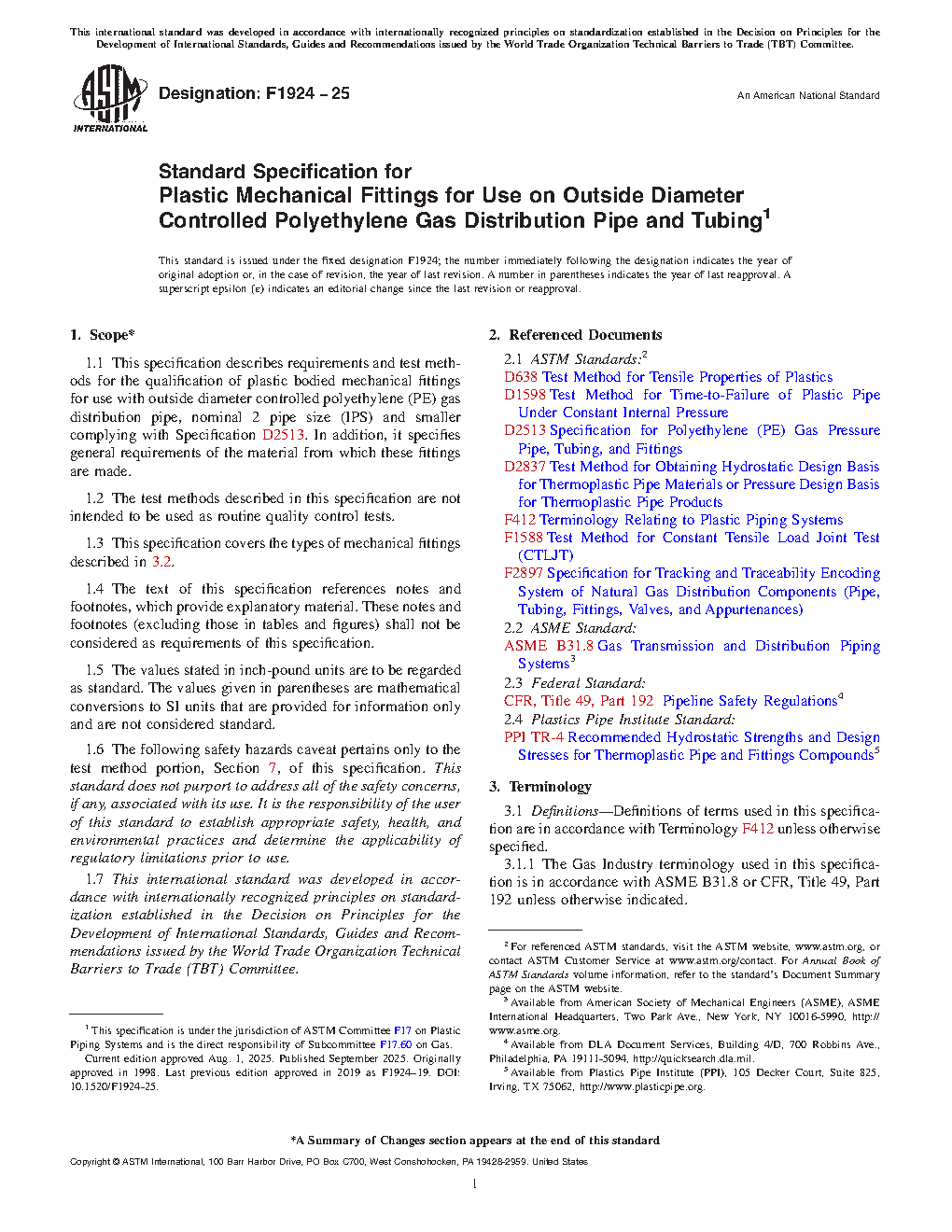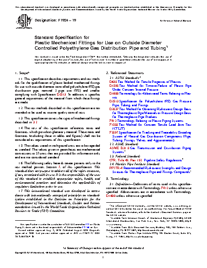 1.1 This specification describes requirements and test methods for the qualification of plastic bodied mechanical fittings for use with outside diameter controlled polyethylene (PE) gas distribution pipe, nominal 2 pipe size (IPS) and smaller complying with Specification D2513. In addition, it specifies general requirements of the material from which these fittings are made.