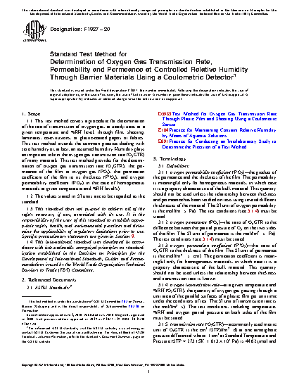 1.1 This test method covers a procedure for determination of the rate of transmission of oxygen gas, at steady-state, at a given temperature and %RH level, through film, sheeting, laminates, co-extrusions, or plastic-coated papers or fabrics. This test method extends the common practice dealing with zero humidity or, at best, an assumed humidity. Humidity plays an important role in the oxygen gas transmission rate (O2GTR) of many materials. This test method provides for the determination of oxygen gas transmission rate (O2GTR), the permeance of the film to oxygen gas (PO2), the permeation coefficient of the film to its thickness (P”O2), and oxygen permeability coefficient (PʹO2) in the case of homogeneous materials at given temperature and %RH level(s).
