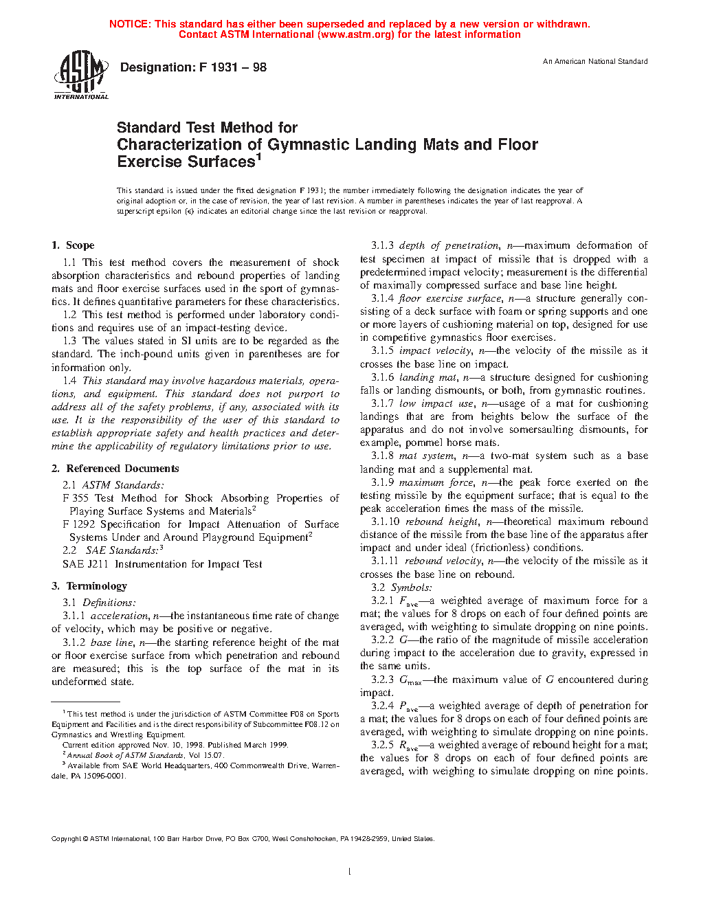 1.1 This test method covers the measurement of shock absorption characteristics and rebound properties of landing mats and floor exercise surfaces used in the sport of gymnastics. It defines quantitative parameters for these characteristics.