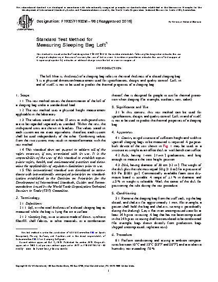 1.1 This test method covers the determination of the loft of a sleeping bag under a standardized load.