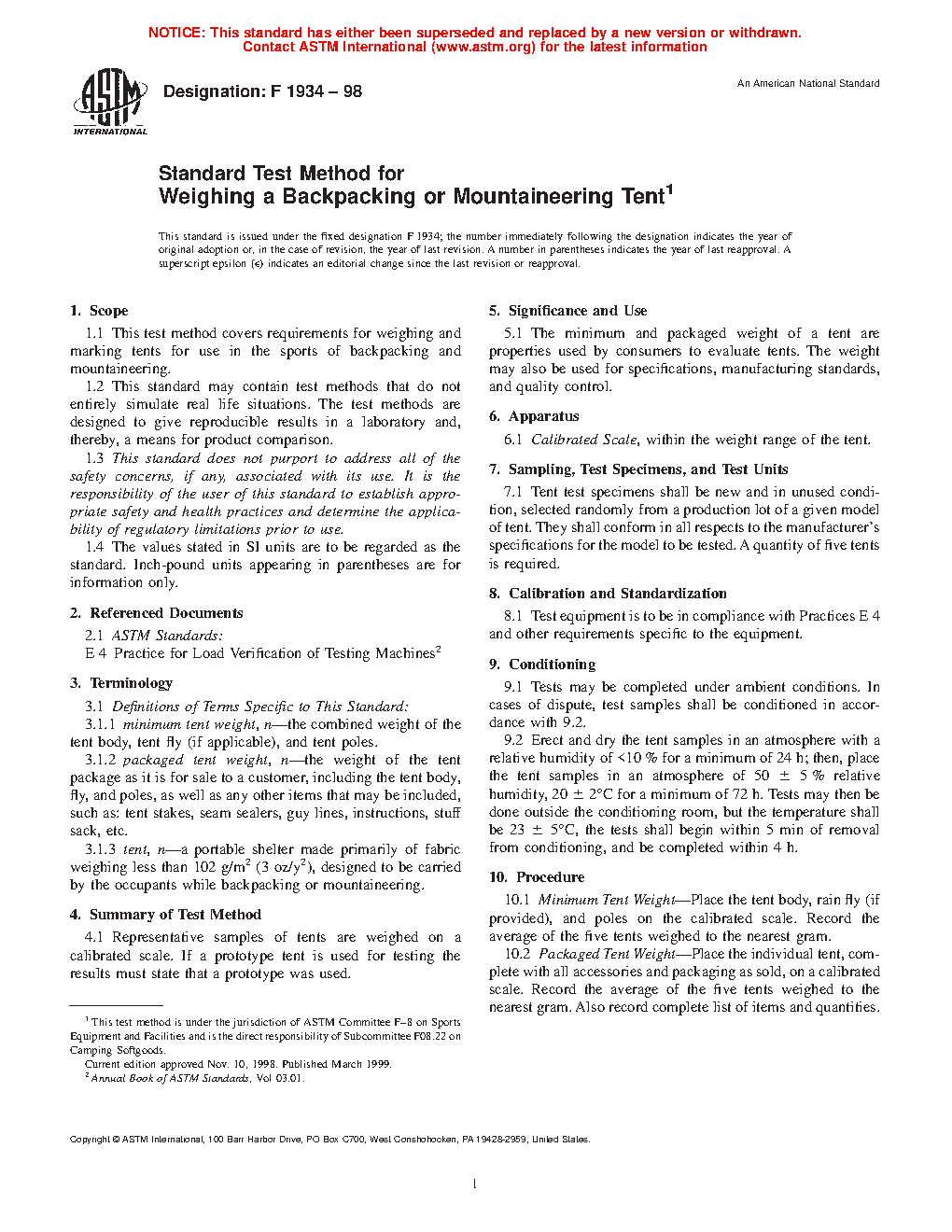 1.1 This test method covers requirements for weighing and marking tents for use in the sports of backpacking and mountaineering.