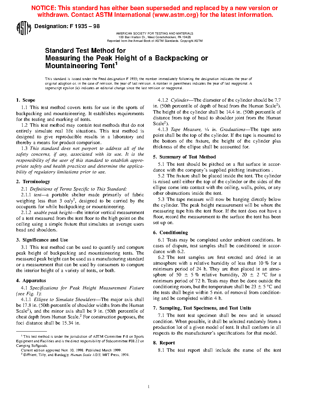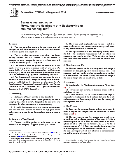 1.1 This test method covers tents for use in the sports of backpacking and mountaineering. It establishes requirements for the testing and marking of tents.