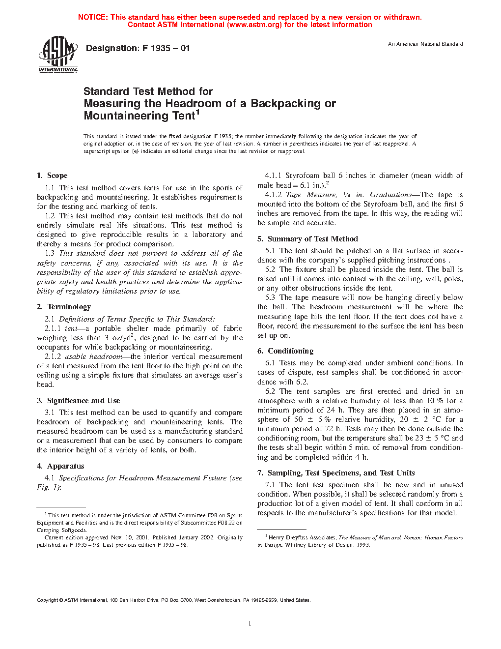 4.1 This test method can be used to quantify and compare headroom of backpacking and mountaineering tents. The measured headroom can be used as a manufacturing standard or a measurement that can be used by consumers to compare the interior height of a variety of tents, or both.
