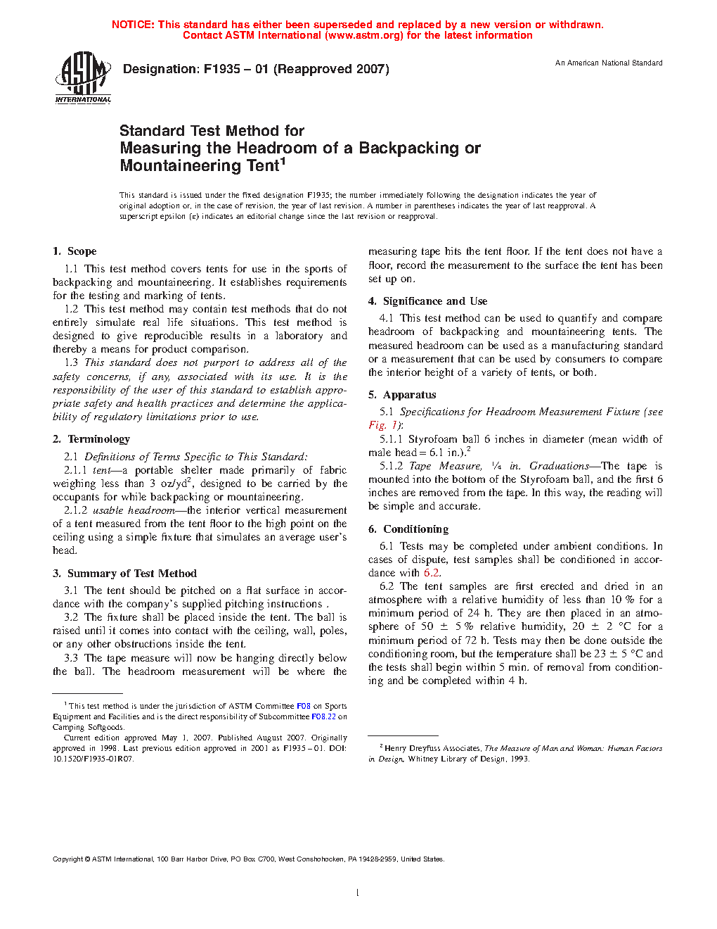 1.1 This test method covers tents for use in the sports of backpacking and mountaineering. It establishes requirements for the testing and marking of tents.