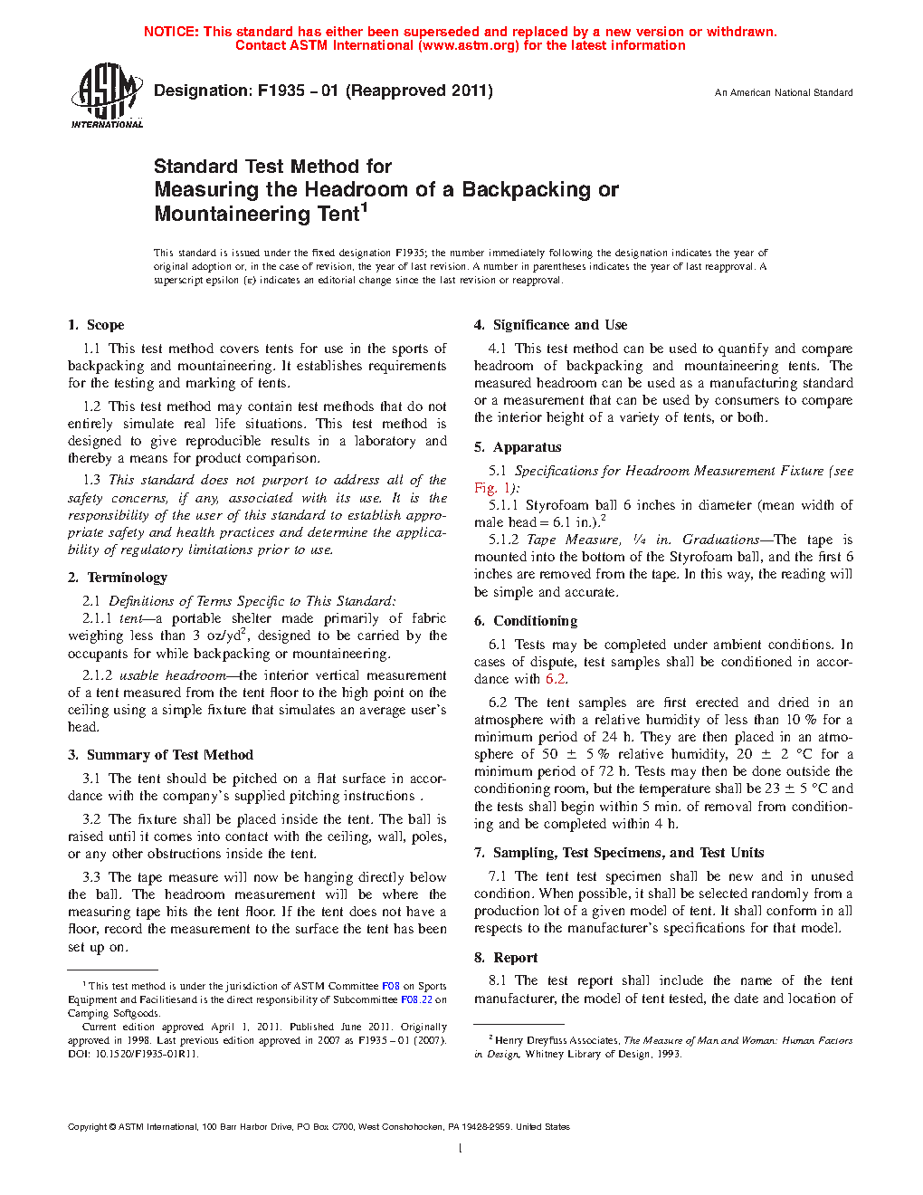 Standard Test Method for Measuring the Headroom of a Backpacking or Mountaineering Tent