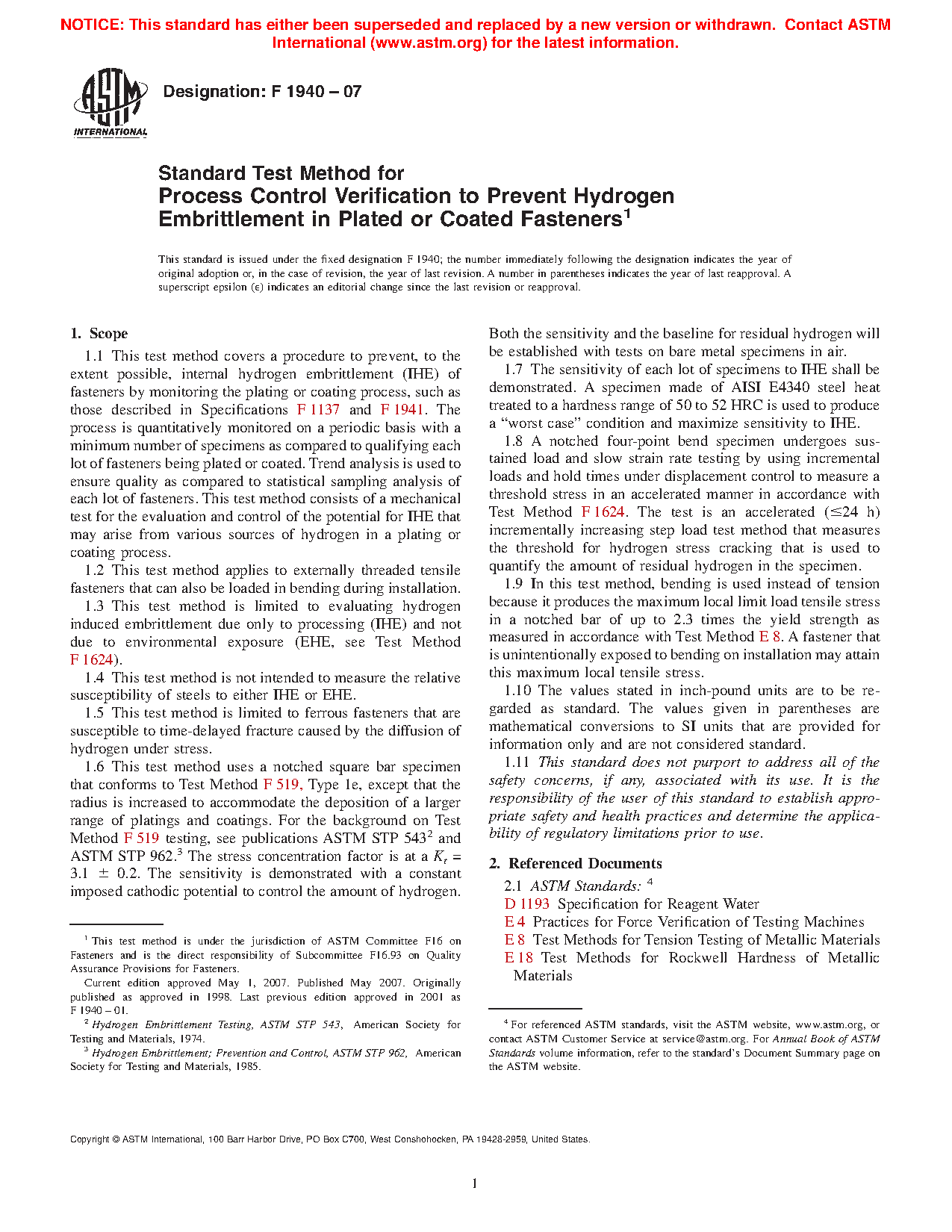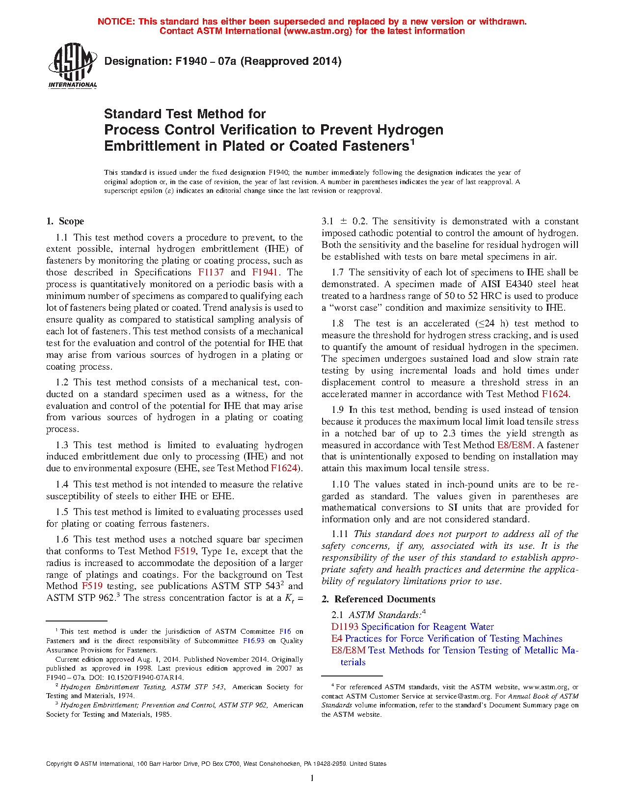 1.1 This test method covers a procedure to prevent, to the extent possible, internal hydrogen embrittlement (IHE) of fasteners by monitoring the plating or coating process, such as those described in Specifications F 1137 and F 1941. The process is quantitatively monitored on a periodic basis with a minimum number of specimens as compared to qualifying each lot of fasteners being plated or coated. Trend analysis is used to ensure quality as compared to statistical sampling analysis of each lot of fasteners. This test method consists of a mechanical test for the evaluation and control of the potential for IHE that may arise from various sources of hydrogen in a plating or coating process.