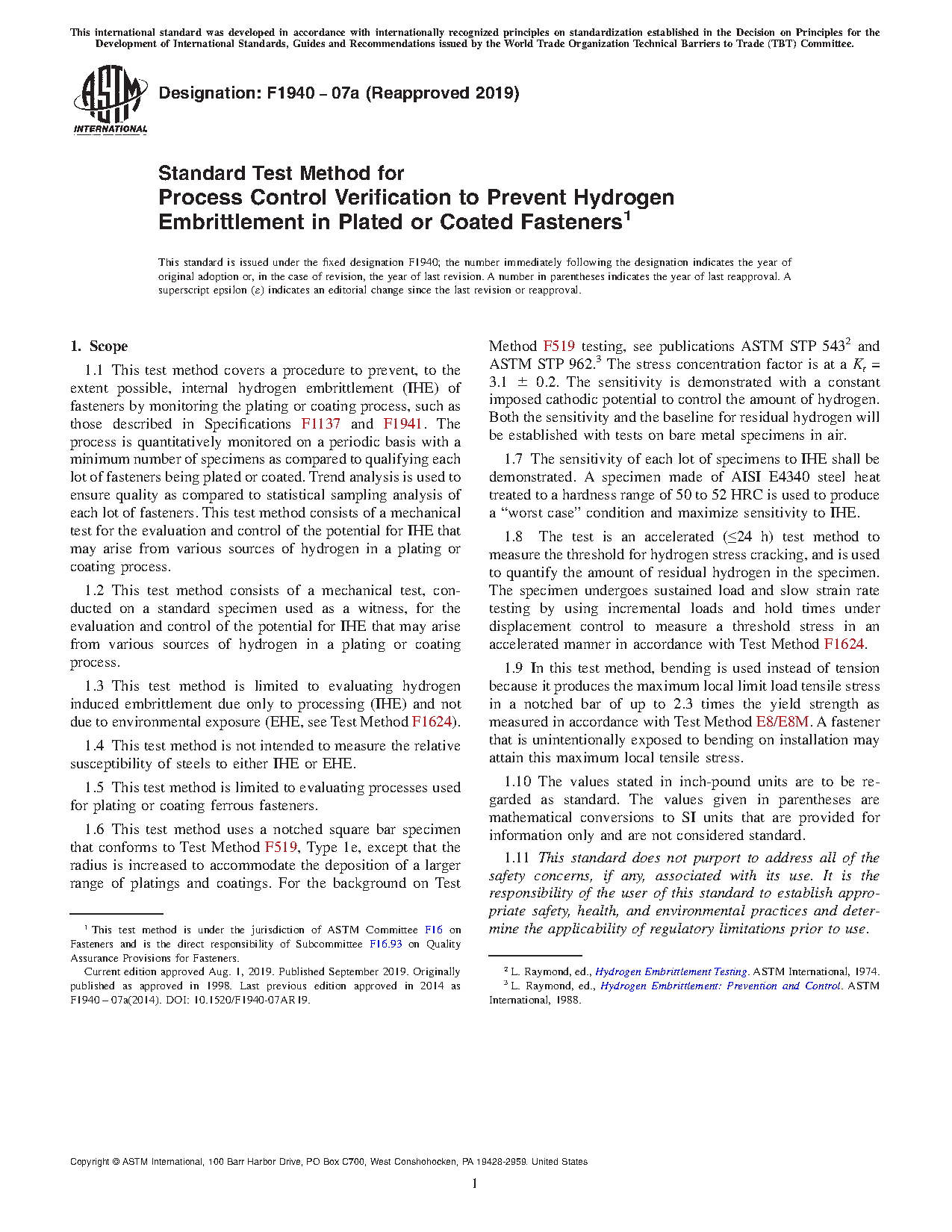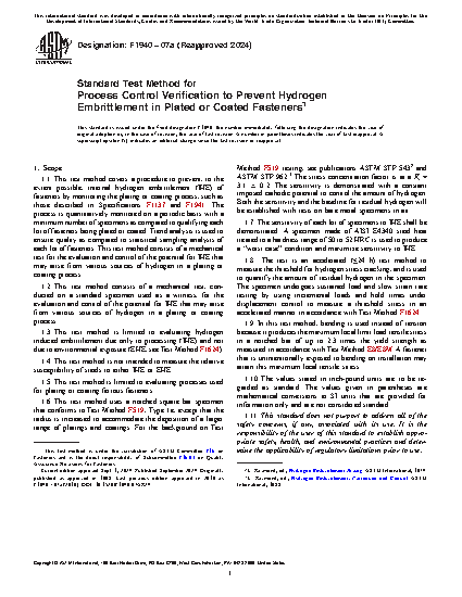 This test method establishes a means to verify the prevention, to the extent possible, of IHE in steel fasteners during manufacture by maintaining strict controls during production operations such as surface preparation, pretreatments, and plating or coating. It is intended to be used as a qualification test for new or revised plating or coating processes and as a periodic inspection audit for the control of a plating or coating process.