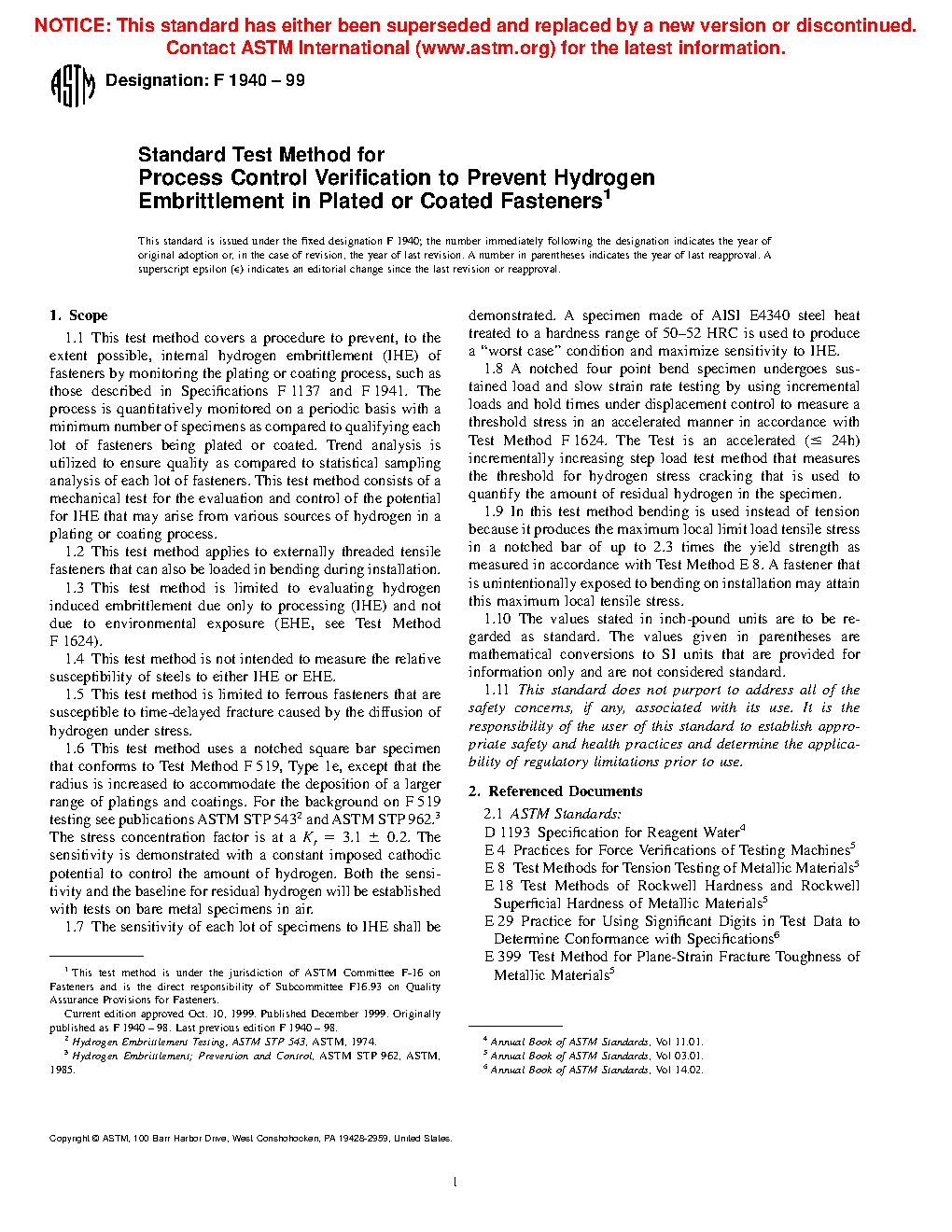1.3 This test method is limited to evaluating hydrogen induced embrittlement due only to processing (IHE) and not due to environmental exposure (EHE, see Test Method F 1624).