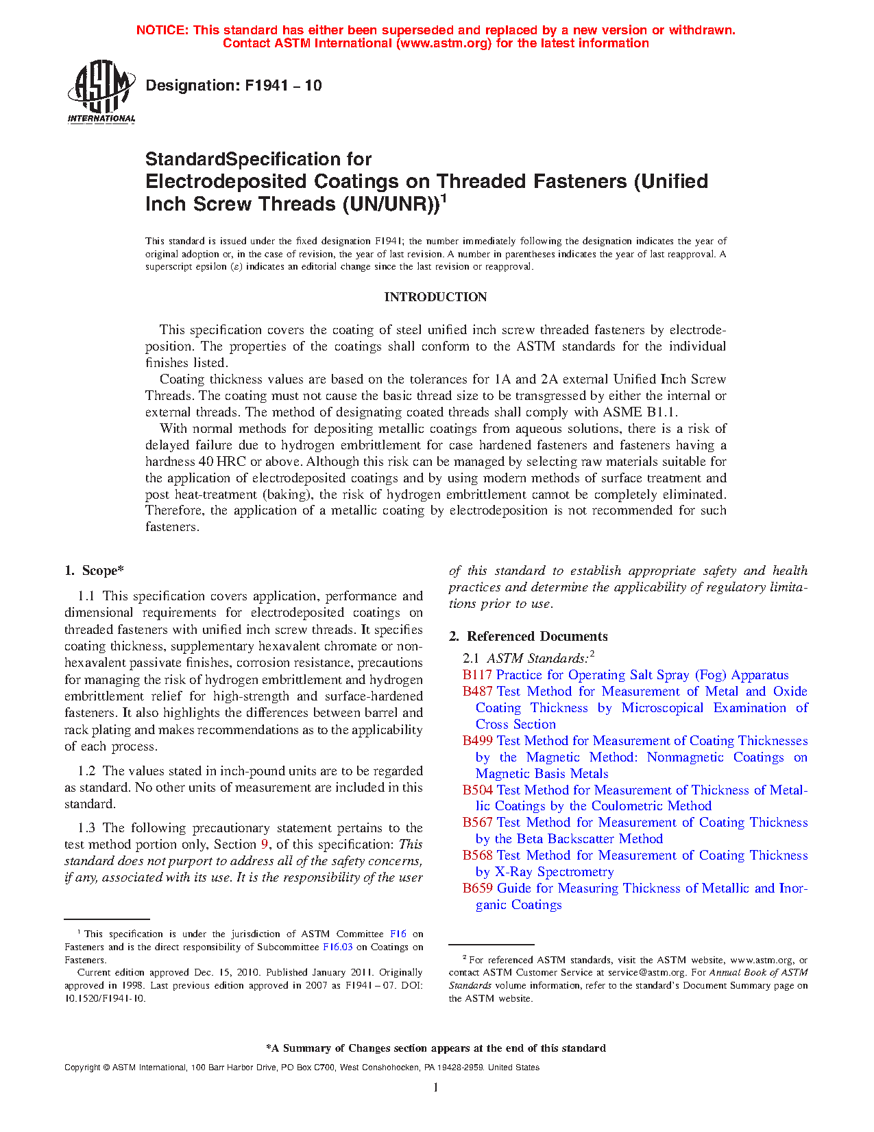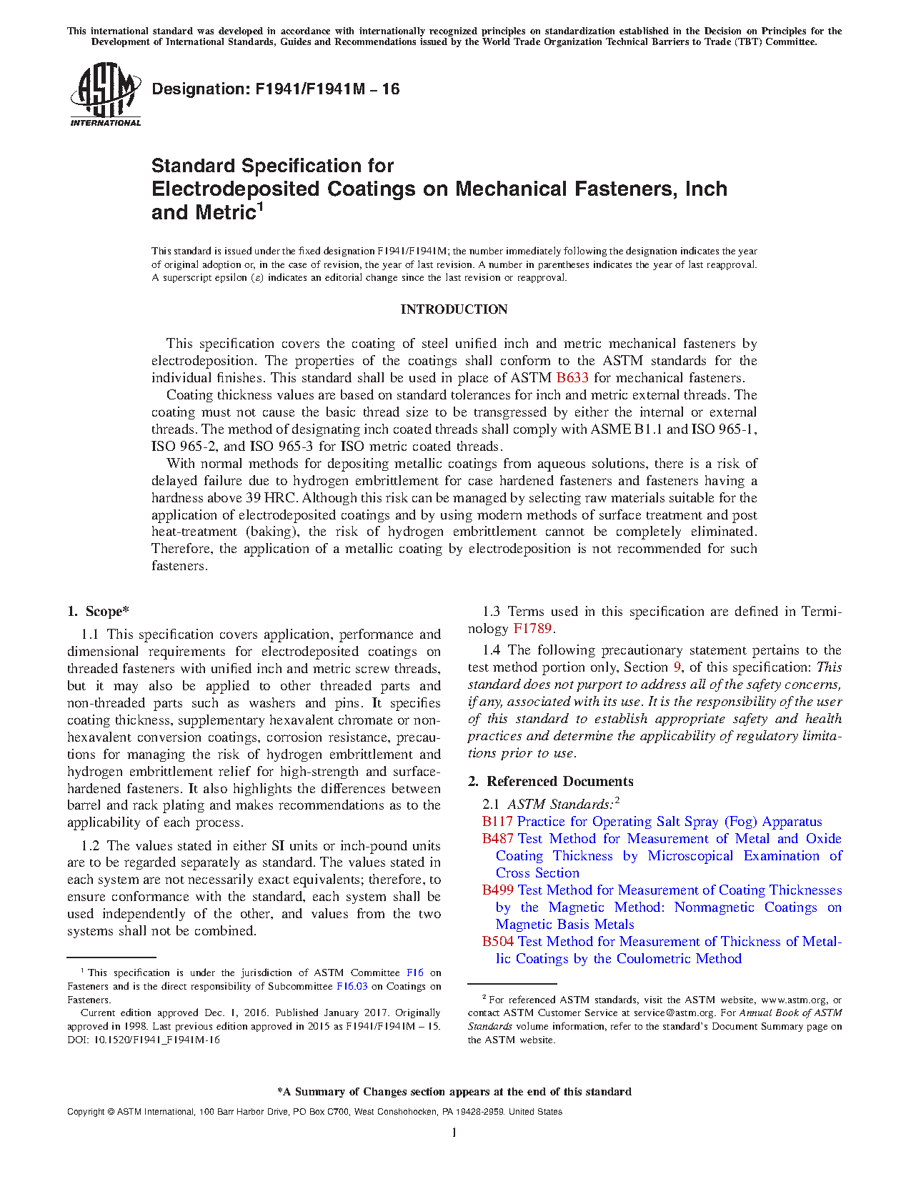 1.1 This specification covers application, performance and dimensional requirements for electrodeposited coatings on threaded fasteners with unified inch and metric screw threads, but it may also be applied to other threaded parts and non-threaded parts such as washers and pins. It specifies coating thickness, supplementary hexavalent chromate or non-hexavalent conversion finishes, corrosion resistance, precautions for managing the risk of hydrogen embrittlement and hydrogen embrittlement relief for high-strength and surface-hardened fasteners. It also highlights the differences between barrel and rack plating and makes recommendations as to the applicability of each process.