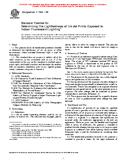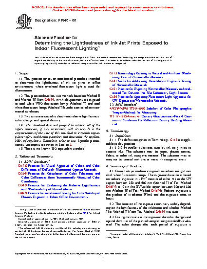 1.1 This practice covers an accelerated procedure intended to determine the lightfastness of ink jet prints in office environments where overhead fluorescent light is used for illumination.
