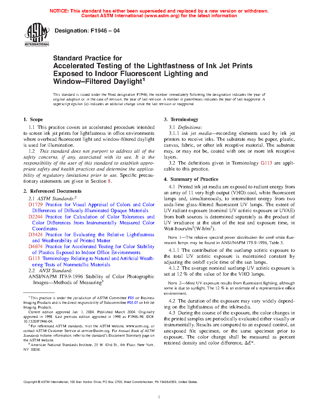 1.1 This practice covers an accelerated procedure intended to determine the lightfastness of ink jet prints in office environments where overhead fluorescent light and window-filtered daylight is used for illumination.
