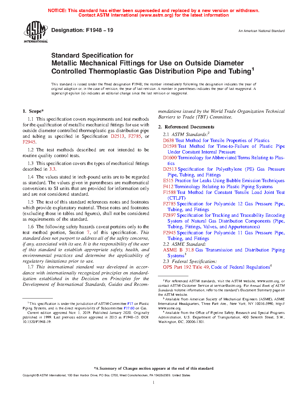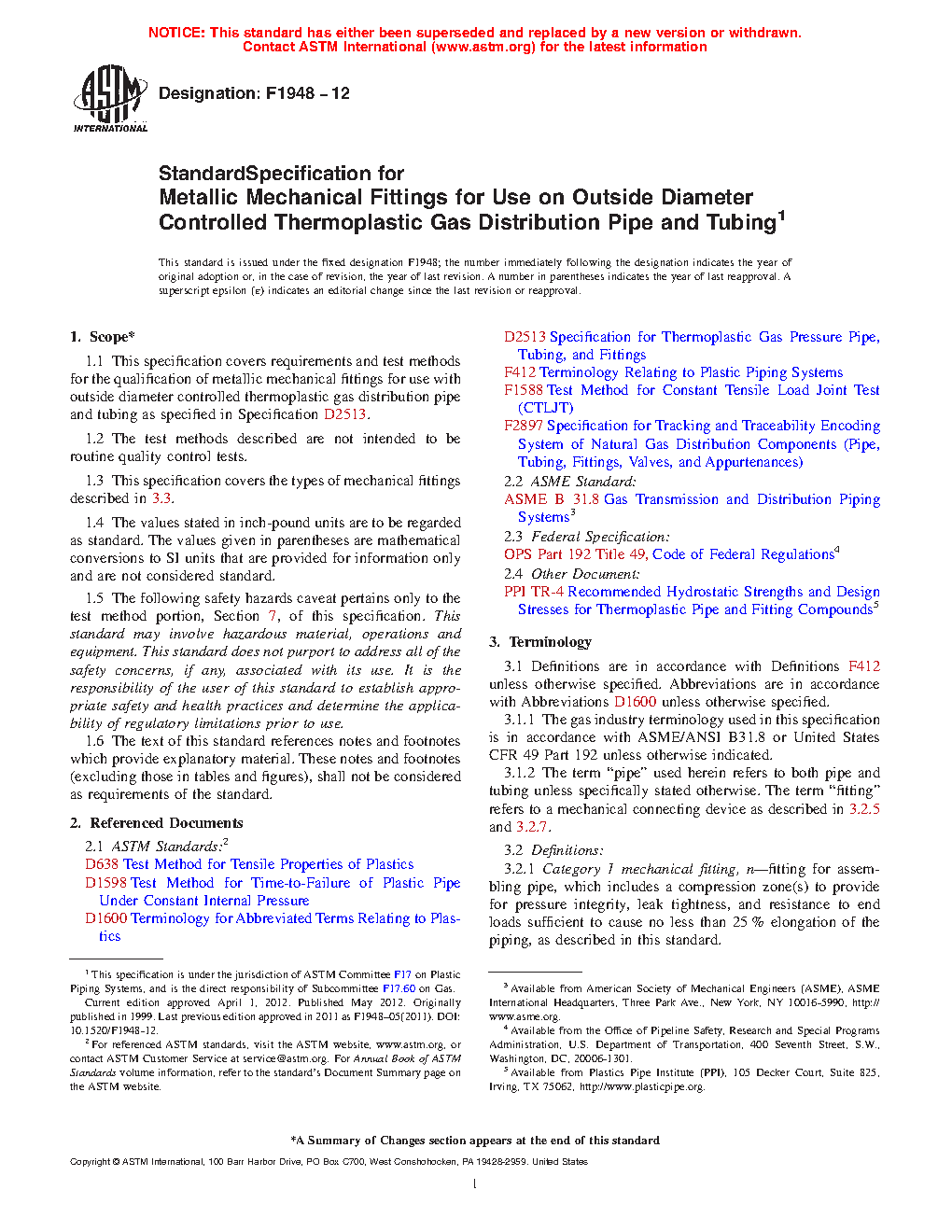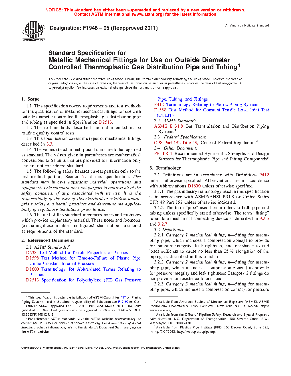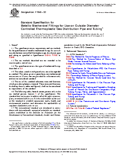 1.1 This specification covers requirements and test methods for the qualification of metallic mechanical fittings for use with outside diameter controlled thermoplastic gas distribution pipe and tubing as specified in Specification D2513, F2785, or F2945.