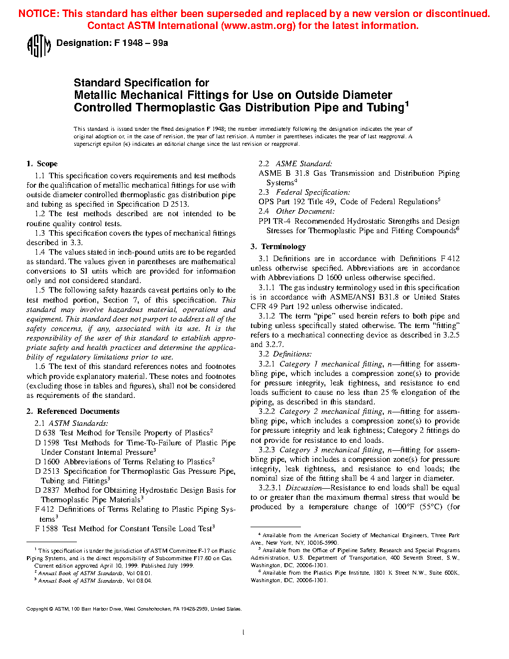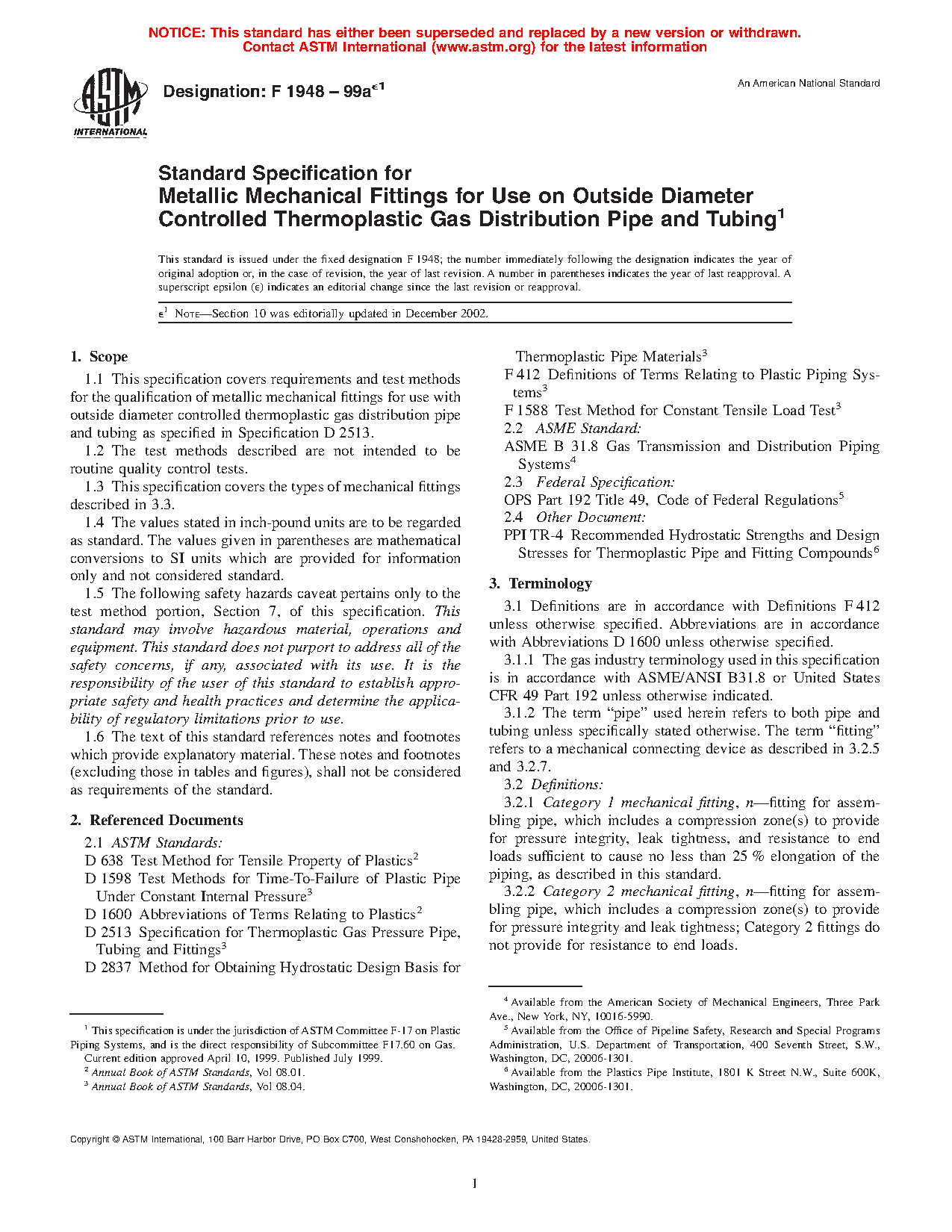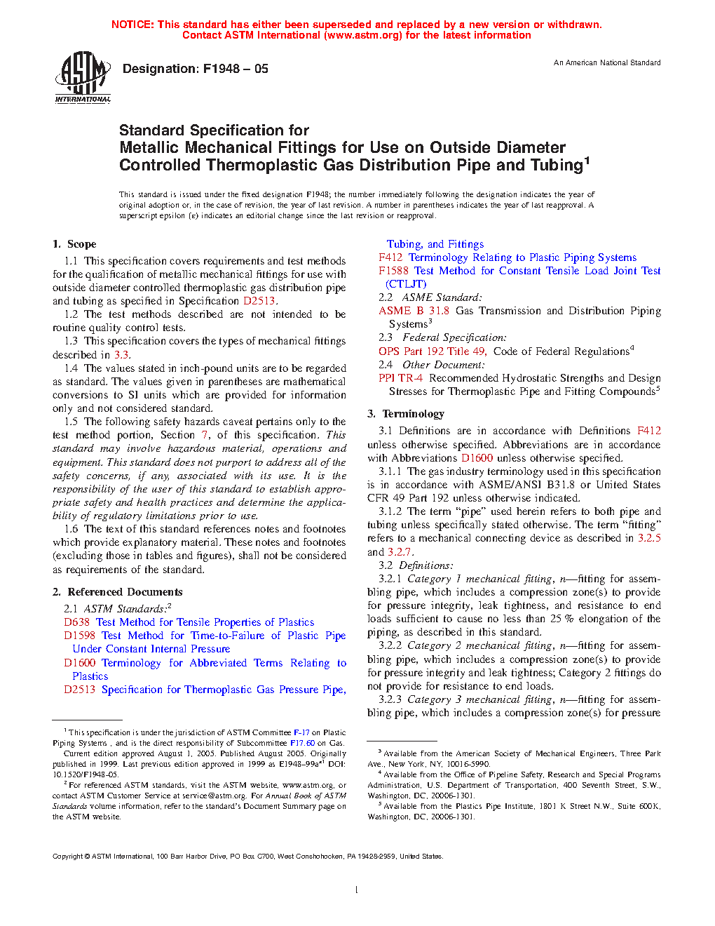 1.1 This specification covers requirements and test methods for the qualification of metallic mechanical fittings for use with outside diameter controlled thermoplastic gas distribution pipe and tubing as specified in Specification D2513, F2785, or F2945.