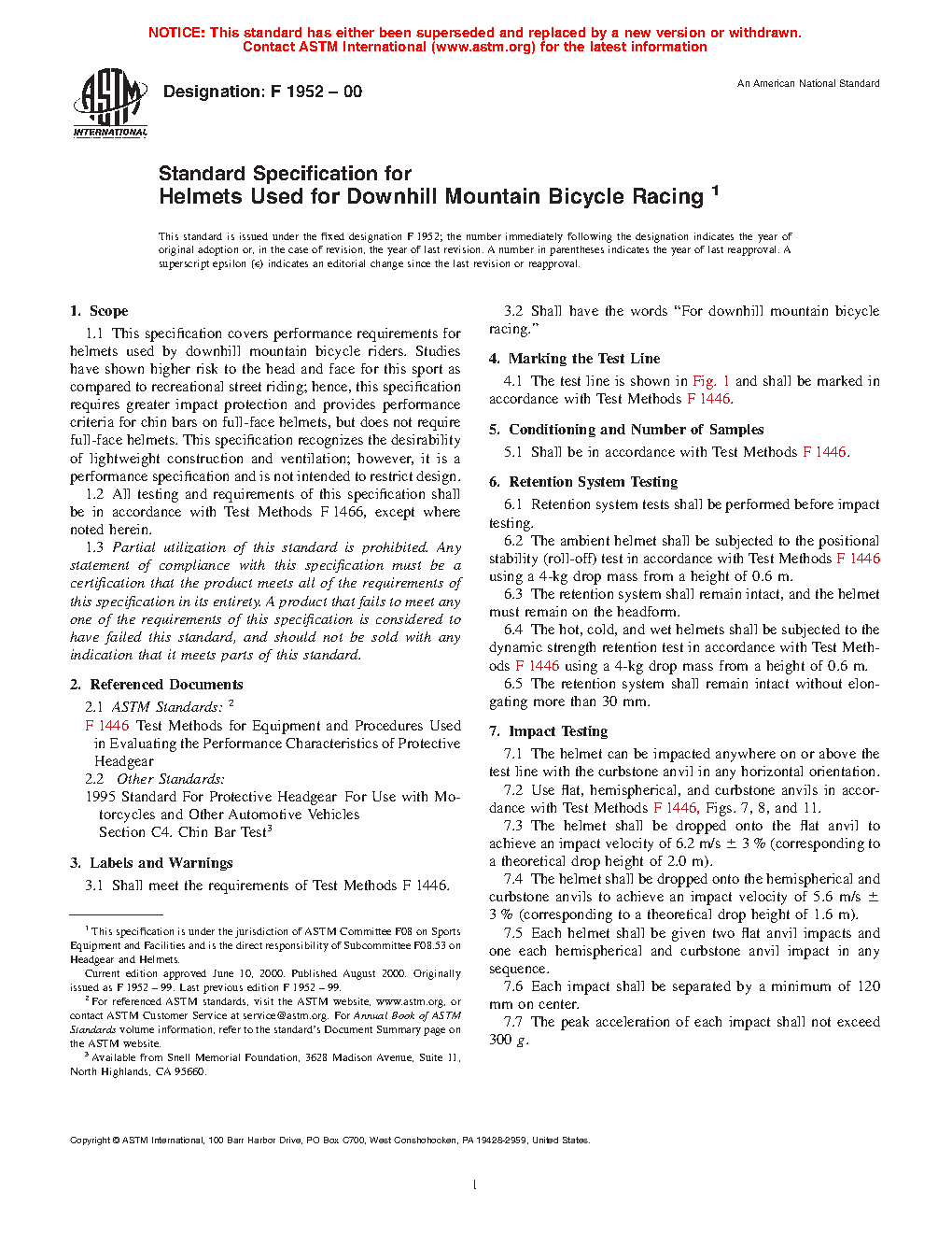 1.1 This specification covers performance requirements for helmets used by downhill mountain bicycle riders. Studies have shown higher risk to the head and face for this sport as compared to recreational street riding; hence, this specification requires greater impact protection and provides performance criteria for chin bars on full-face helmets, but does not require full-face helmets. This specification recognizes the desirability of lightweight construction and ventilation; however, it is a performance specification and is not intended to restrict design.