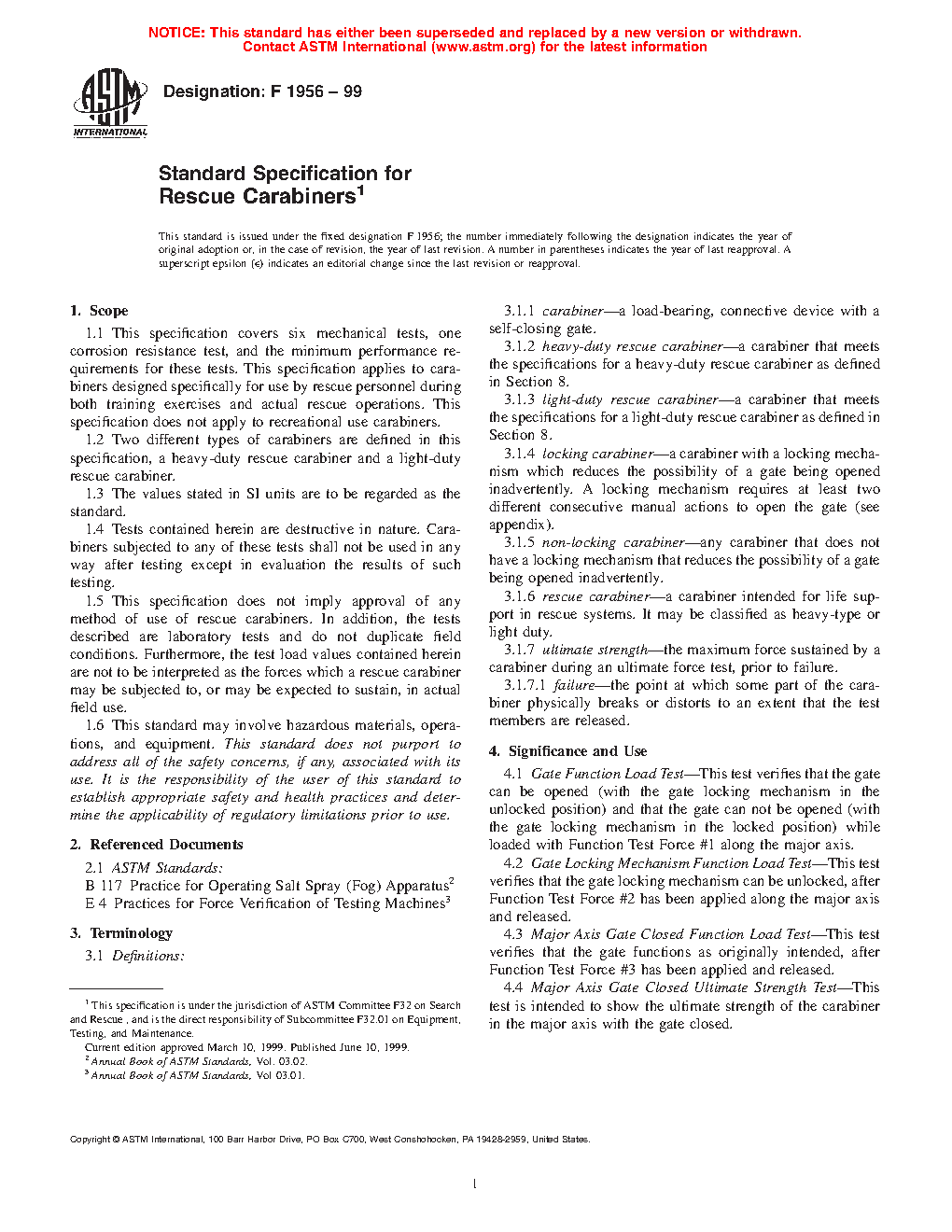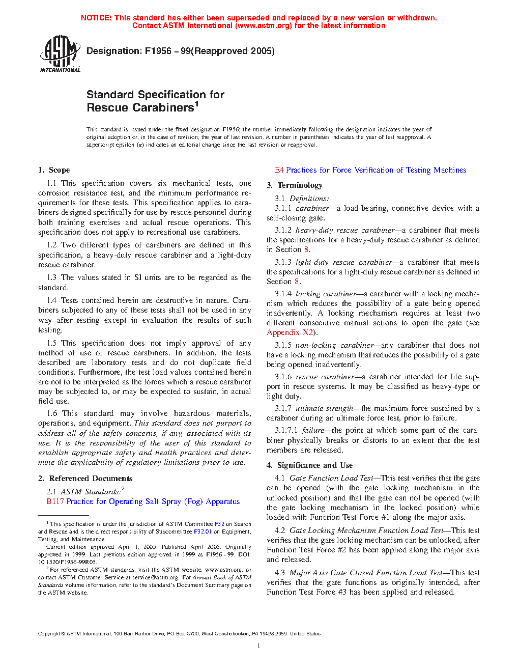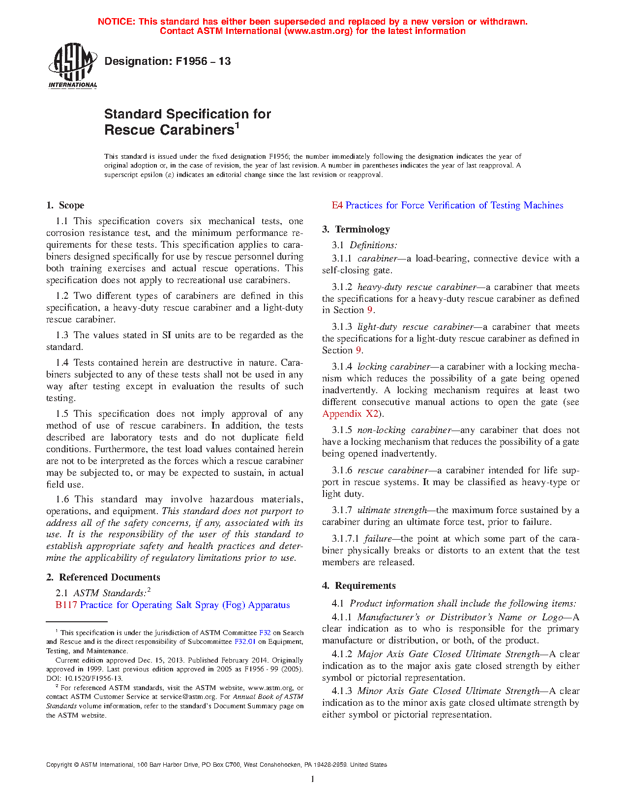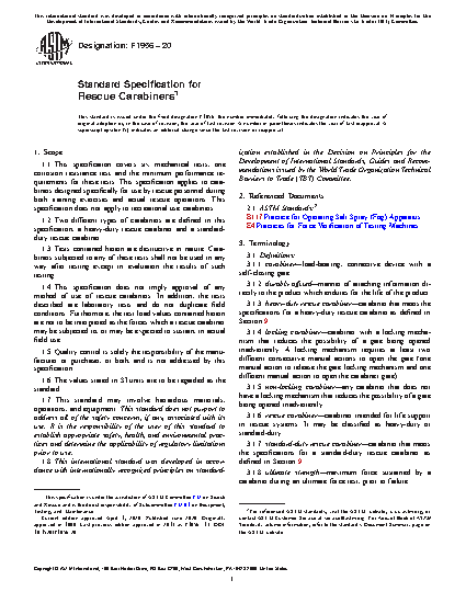 1.1 This specification covers six mechanical tests, one corrosion resistance test, and the minimum performance requirements for these tests. This specification applies to carabiners designed specifically for use by rescue personnel during both training exercises and actual rescue operations. This specification does not apply to recreational use carabiners.