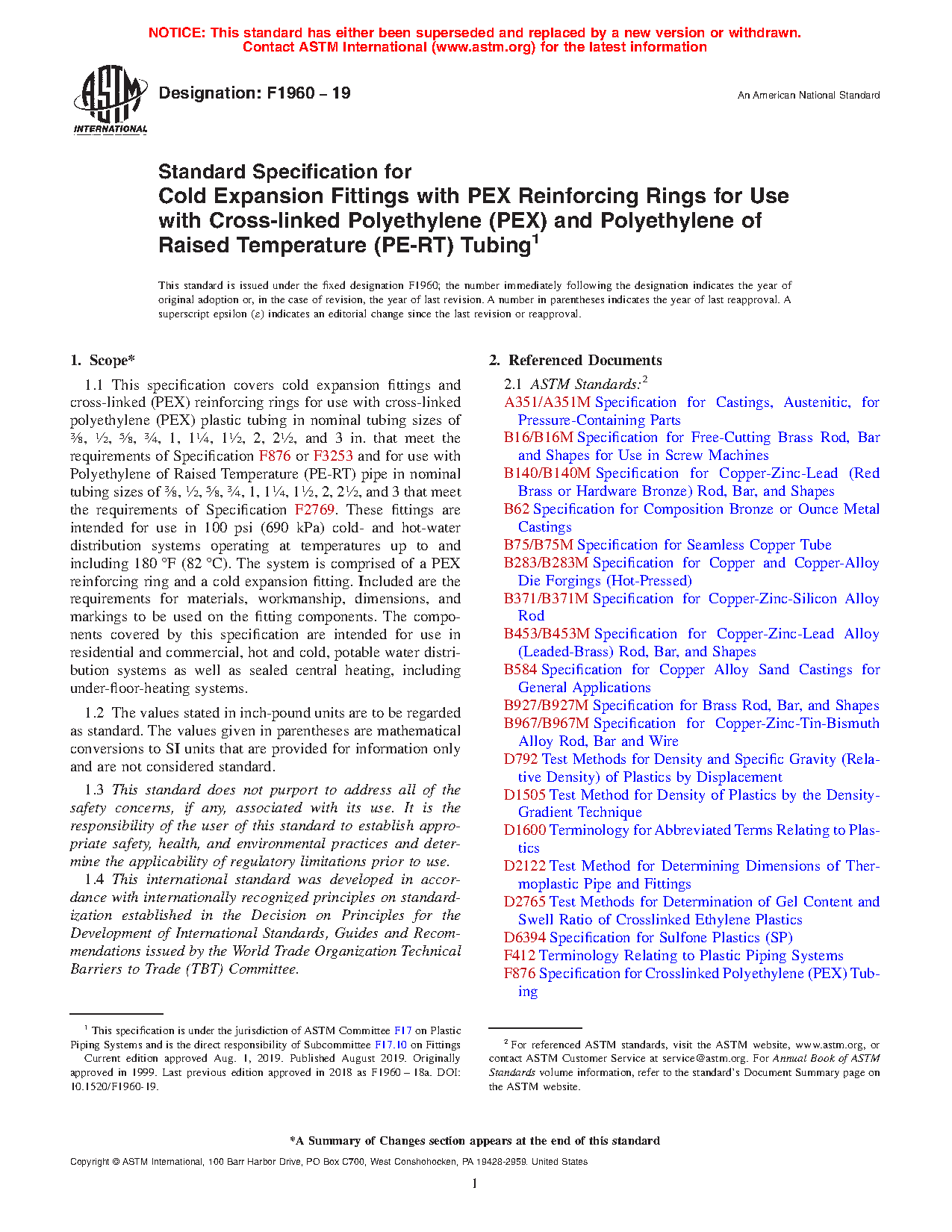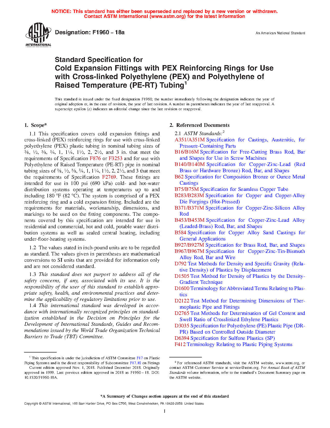 1.1 This specification covers cold expansion fittings and cross-linked (PEX) reinforcing rings for use with cross-linked polyethylene (PEX) plastic tubing in nominal tubing sizes of 3/8 , 1/2 , 5/8 , 3/4 , 1, 11/4 , 11/2 , 2, 21/2 , and 3 in. that meet the requirements of Specification F876 or F3253 and for use with Polyethylene of Raised Temperature (PE-RT) pipe in nominal tubing sizes of 3/8 , 1/2 , 5/8 , 3/4 , 1, 11/4 , 11/2 , 2, 21/2 , and 3 that meet the requirements of Specification F2769. These fittings are intended for use in 100 psi (690 kPa) cold- and hot-water distribution systems operating at temperatures up to and including 180 °F (82 °C). The system is comprised of a PEX reinforcing ring and a cold expansion fitting. Included are the requirements for materials, workmanship, dimensions, and markings to be used on the fitting components. The components covered by this specification are intended for use in residential and commercial, hot and cold, potable water distribution systems as well as sealed central heating, including under-floor-heating systems.