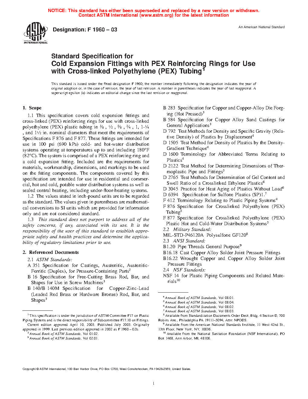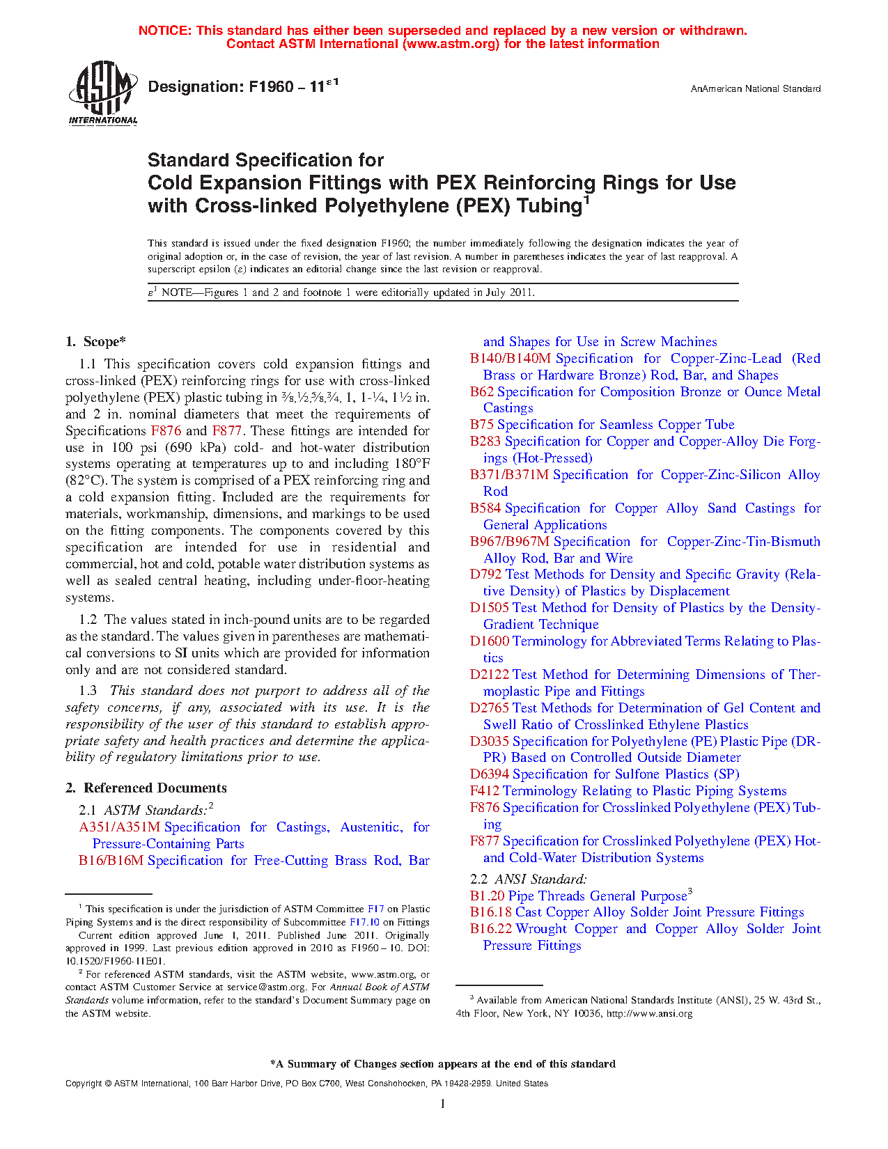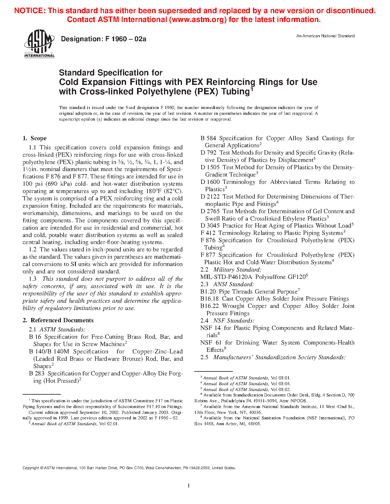This specification covers cold expansion fittings and cross-linked (PEX) reinforcing rings for use with cross-linked polyethylene (PEX) plastic tubing in specific nominal diameters. These fittings are intended for use in residential and commercial, hot and cold, potable water distribution systems as well as sealed central heating, including under-floor-heating systems. The PEX reinforcing rings shall conform to the required density, degree of cross-linking, and stabilizer migration resistance.