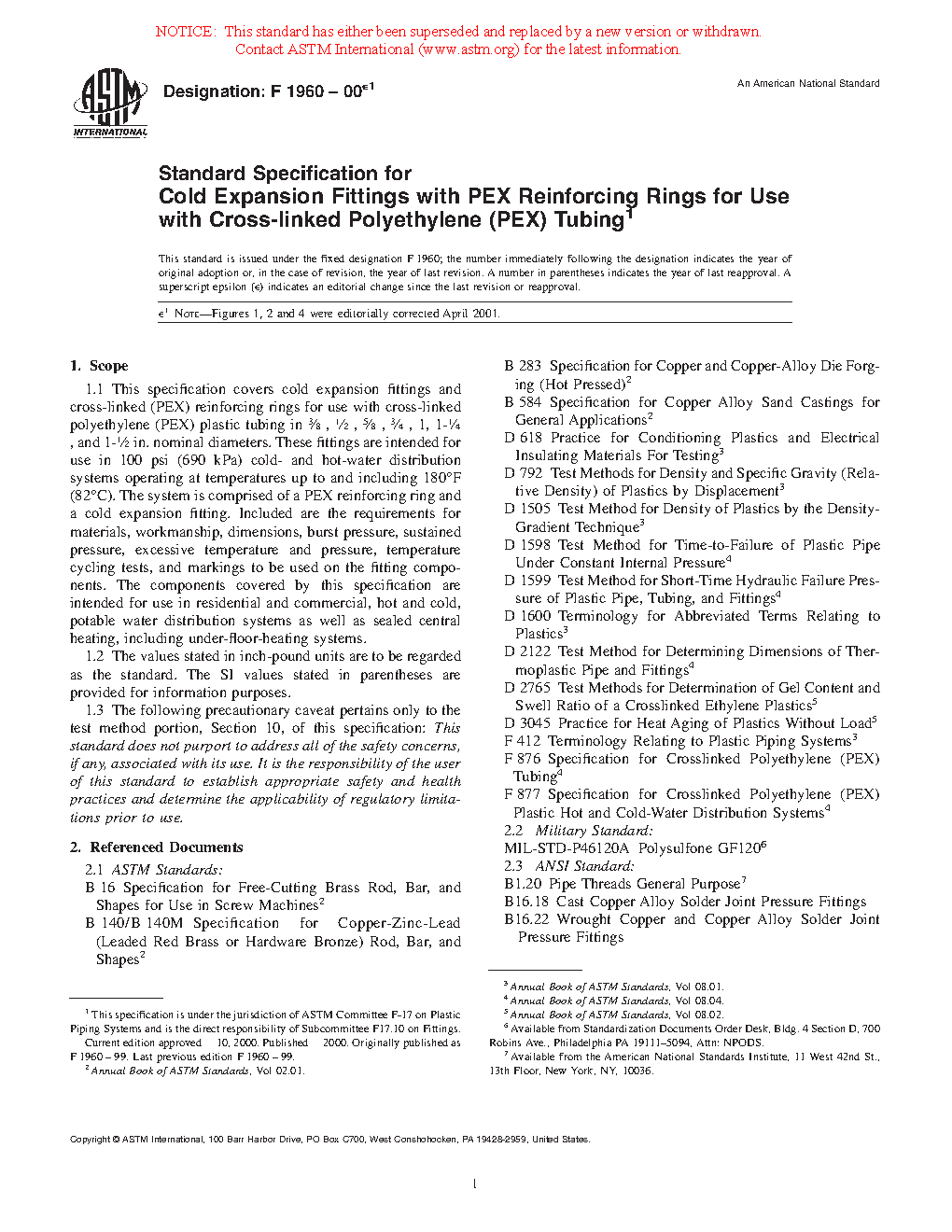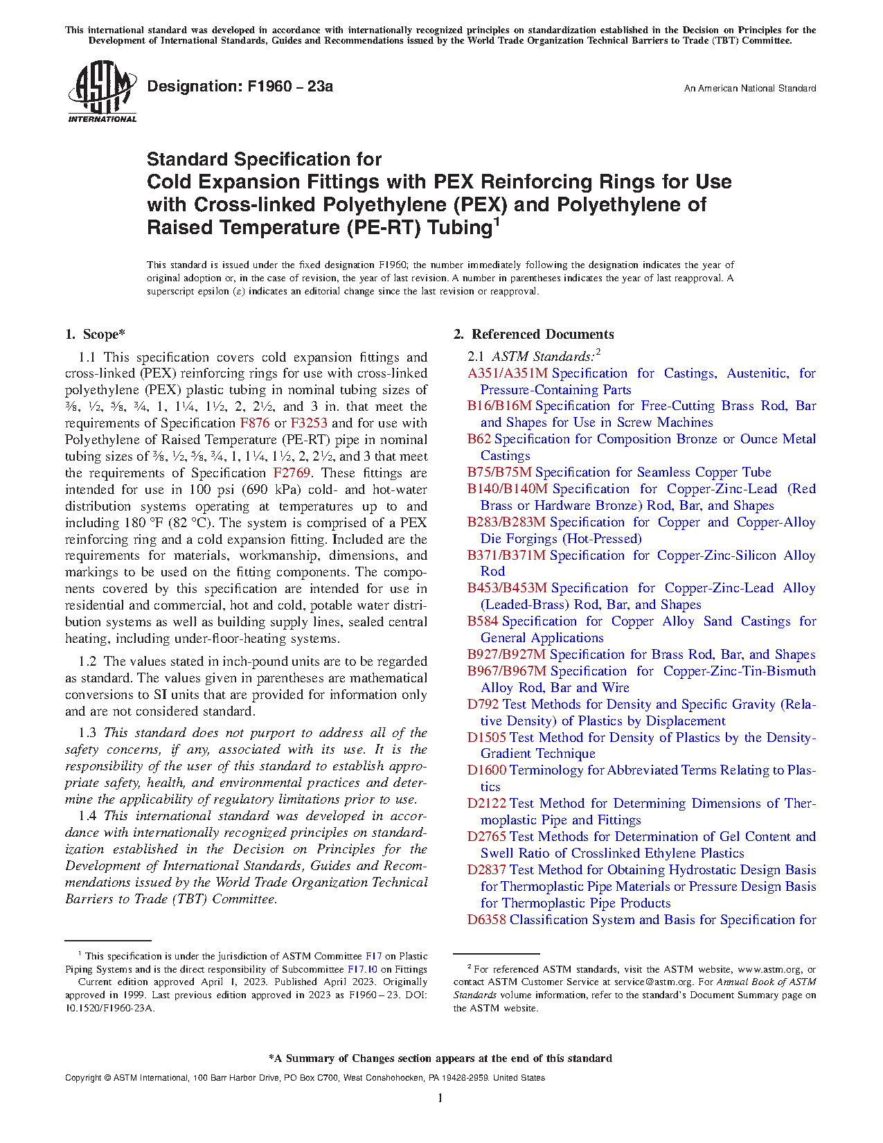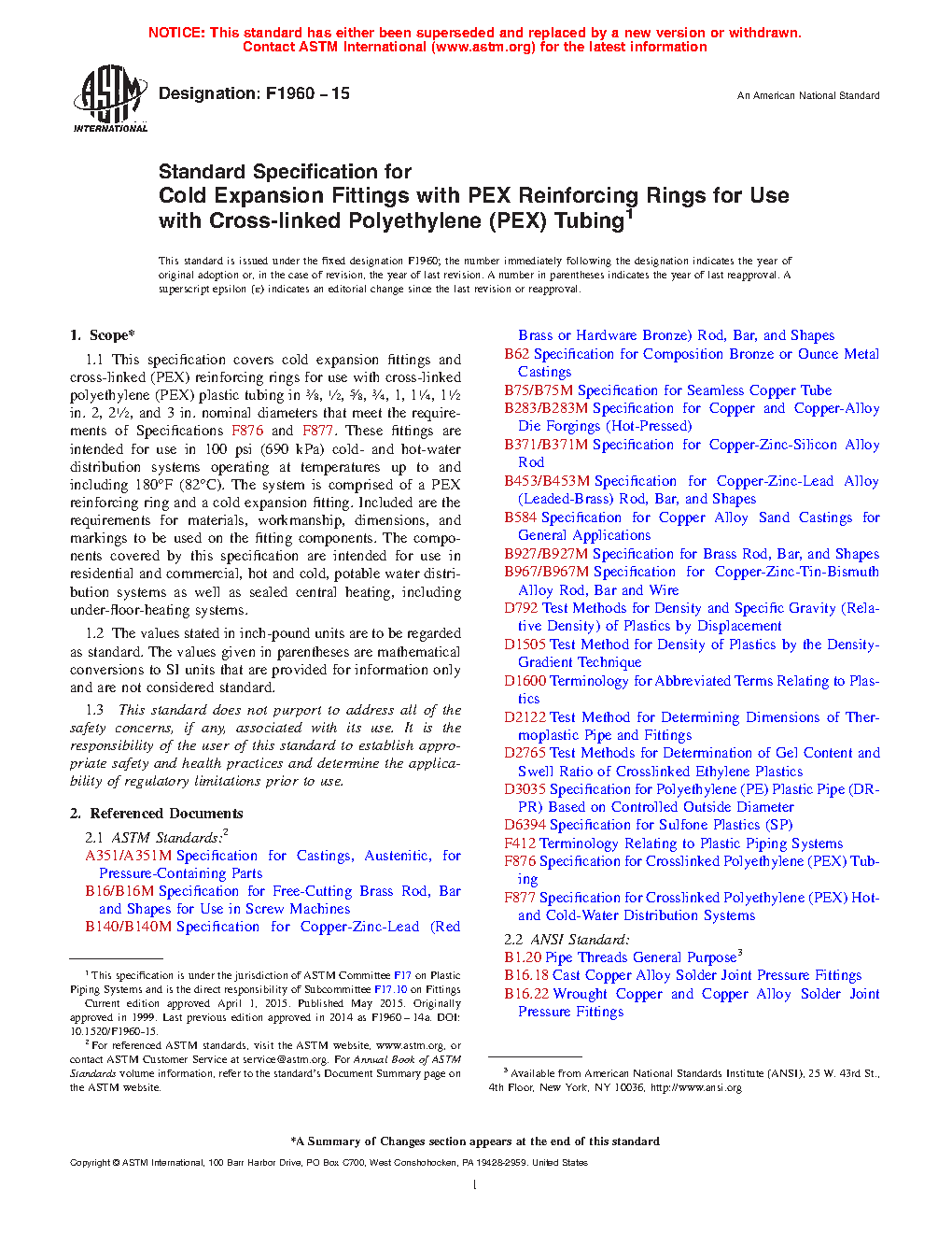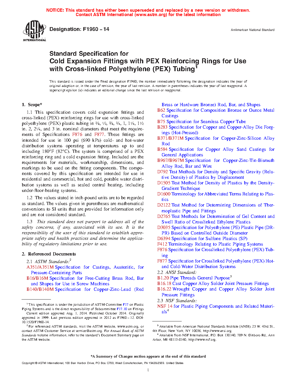 This specification covers cold expansion fittings and cross-linked (PEX) reinforcing rings for use with cross-linked polyethylene (PEX) plastic tubing in specific nominal diameters. These fittings are intended for use in residential and commercial, hot and cold, potable water distribution systems as well as sealed central heating, including under-floor-heating systems. The PEX reinforcing rings shall conform to the required density, degree of cross-linking, and stabilizer migration resistance.
