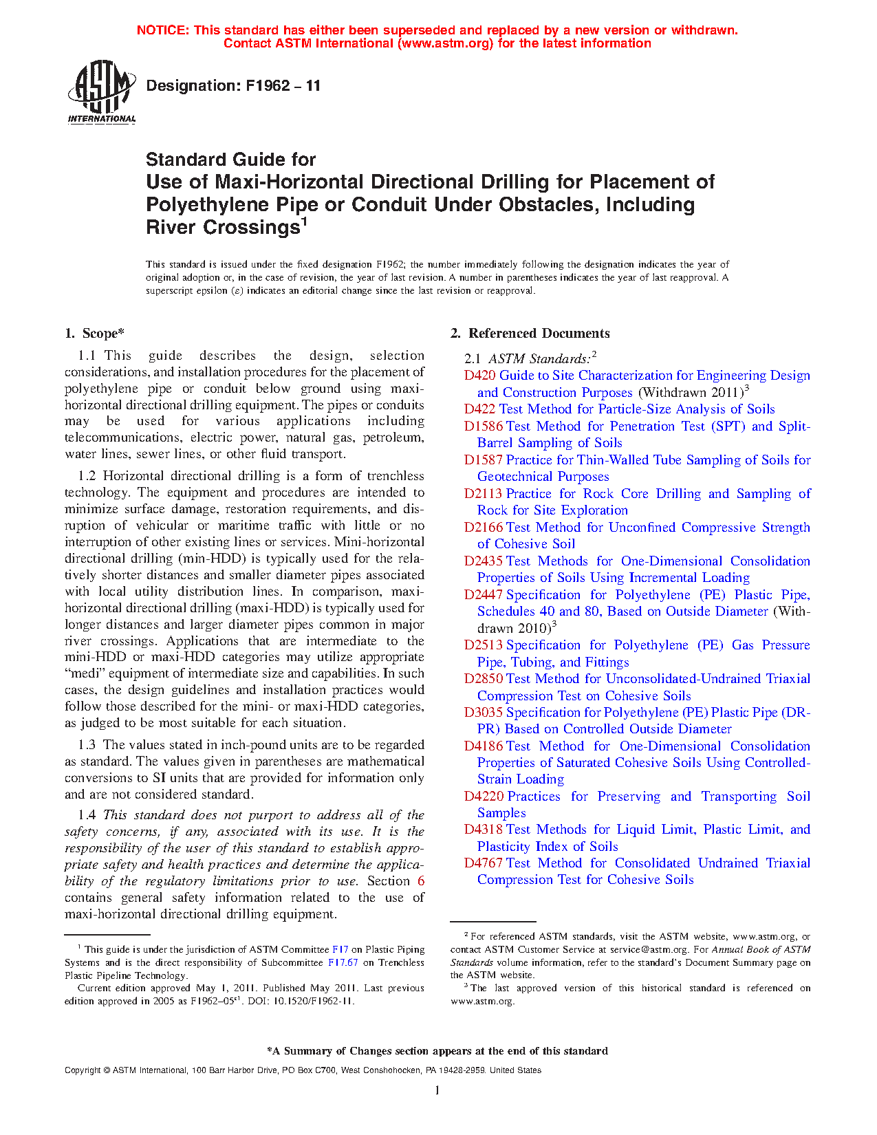 This guide describes the design, selection considerations, and installation procedures for the placement of polyethylene pipe or conduit below ground using maxi-horizontal directional drilling equipment. The pipes or conduits may be used for various applications including telecommunications, electric power, natural gas, petroleum, water lines, sewer lines, or other fluid transport. Horizontal directional drilling is a form of trenchless technology. The equipment and procedures are intended to minimize surface damage, restoration requirements, and disruption of vehicular or maritime traffic with little or no interruption of other existing lines or services. Mini-horizontal directional drilling (min-HDD) is typically used for the relatively shorter distances and smaller diameter pipes associated with local utility distribution lines. In comparison, maxihorizontal directional drilling (maxi-HDD) is typically used for longer distances and larger diameter pipes common in major river crossings. Applications that are intermediate to the mini-HDD or maxi-HDD categories may utilize appropriate “medi” equipment of intermediate size and capabilities. In such cases, the design guidelines and installation practices would follow those described for the mini- or maxi-HDD categories, as judged to be most suitable for each situation.