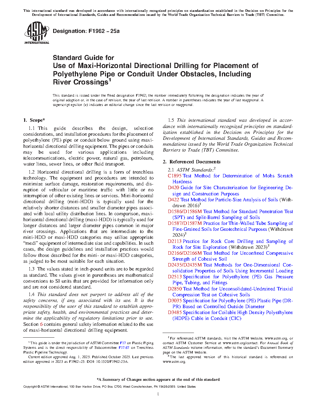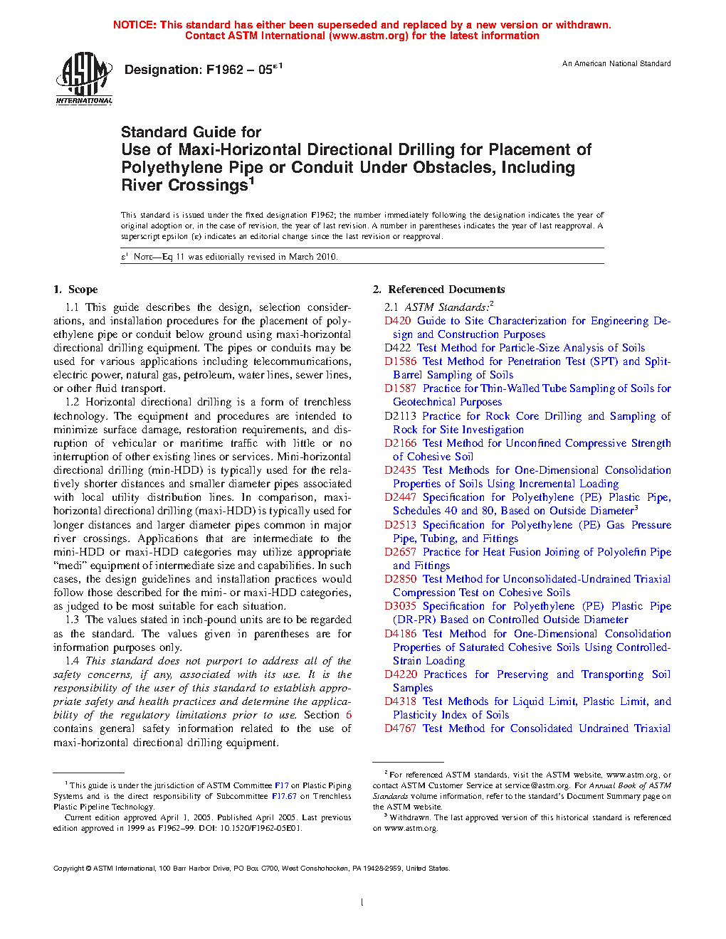 1.1 This guide describes the design, selection considerations, and installation procedures for the placement of polyethylene pipe or conduit below ground using maxi-horizontal directional drilling equipment. The pipes or conduits may be used for various applications including telecommunications, electric power, natural gas, petroleum, water lines, sewer lines, or other fluid transport.