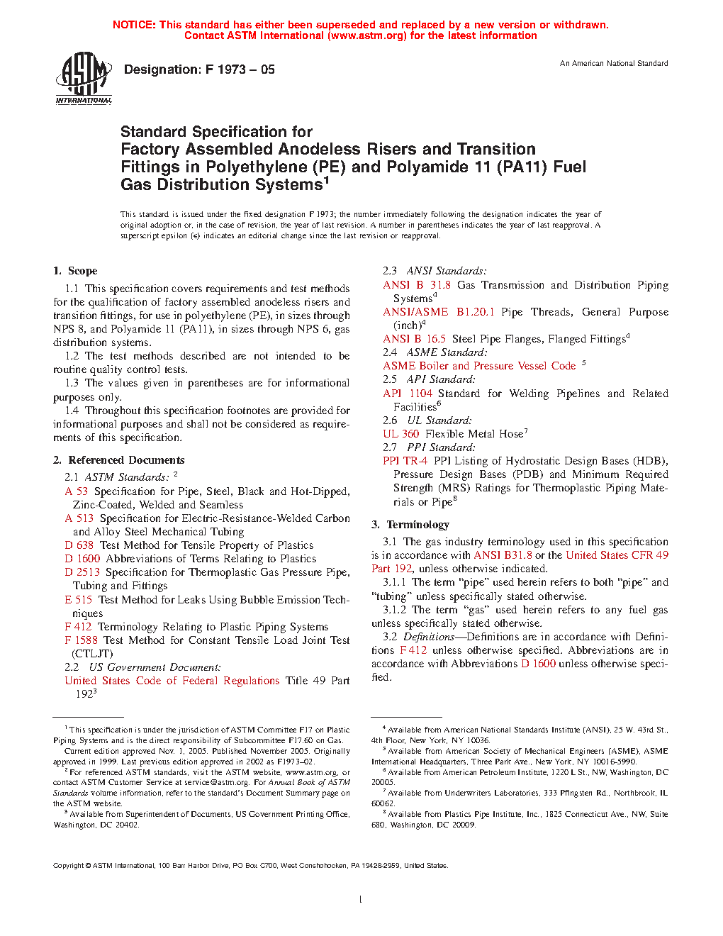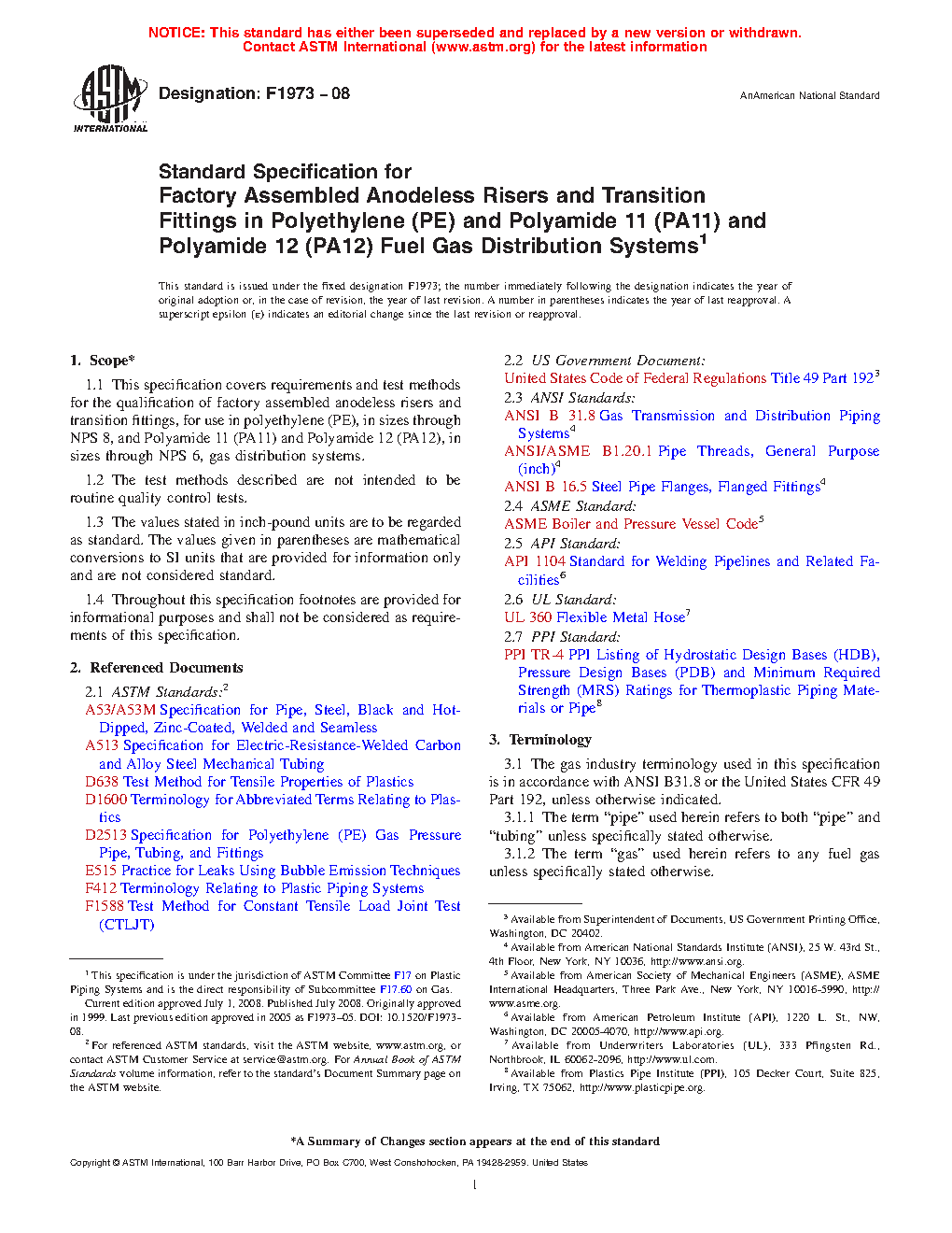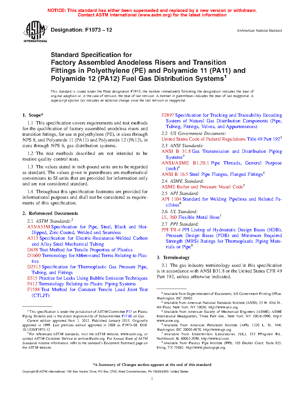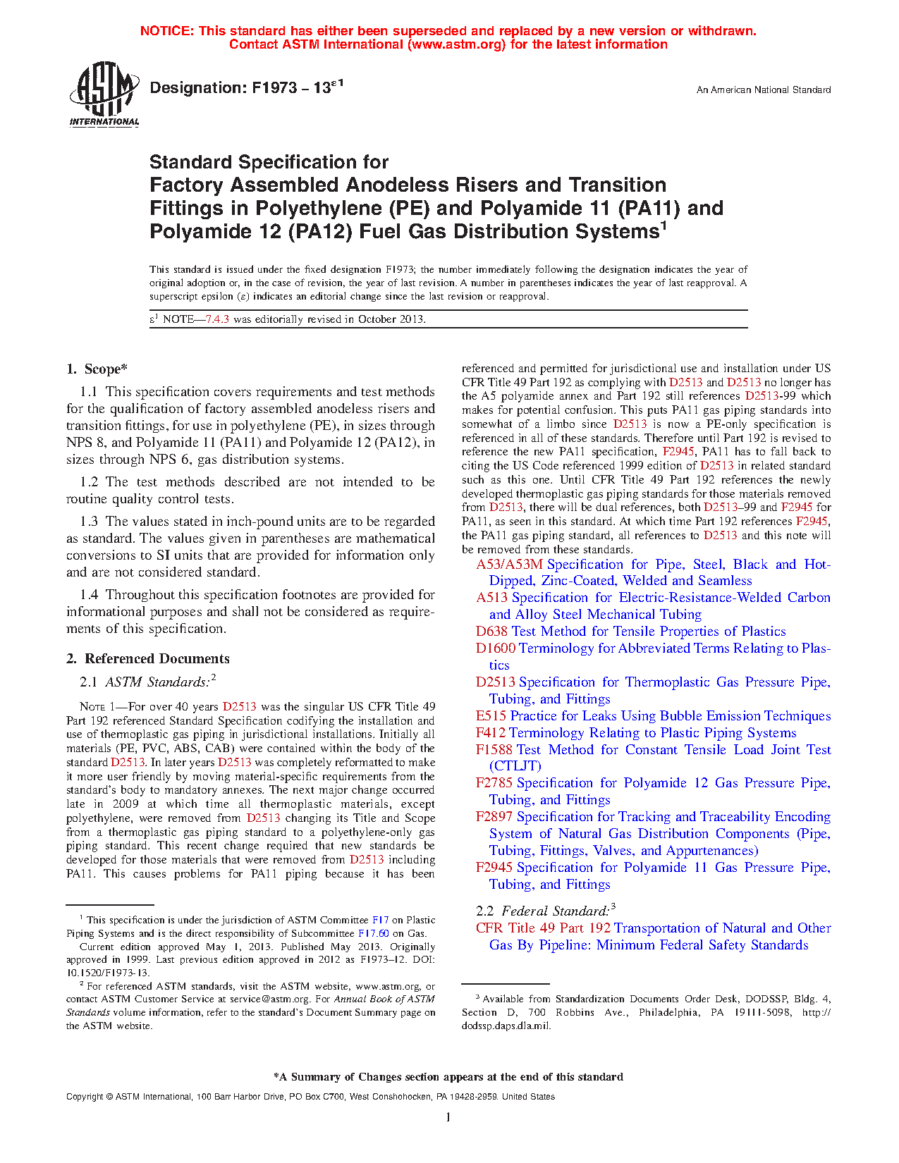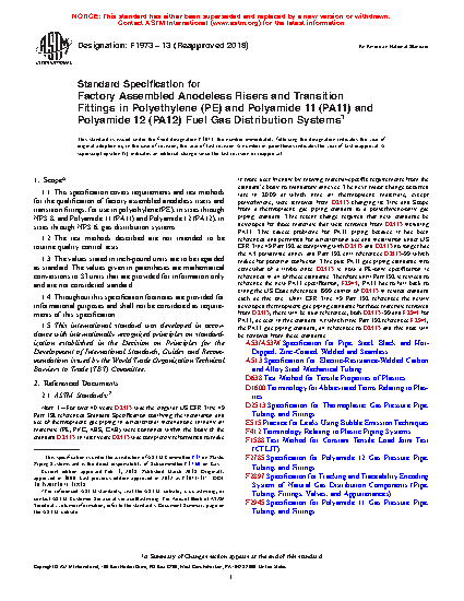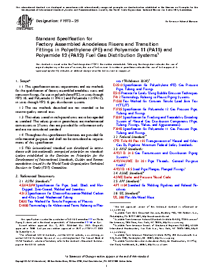 1.1 This specification covers requirements and test methods for the qualification of factory assembled anodeless risers and transition fittings, for use in polyethylene (PE), in sizes through NPS 16, and Polyamide 11 (PA11) and Polyamide 12 (PA12), in sizes through NPS 6, gas distribution systems.