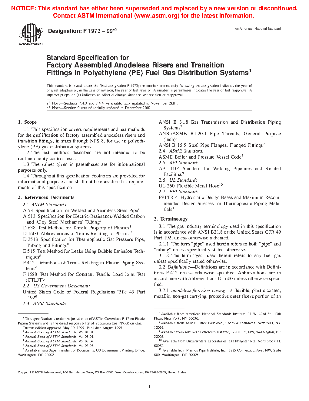 This specification covers requirements and test methods for the qualification of factory assembled anodeless risers and transition fittings, for use in polyethylene (PE), in sizes through NPS 8, and Polyamide 11 (PA11), in sizes through NPS 6, gas distribution systems. The bend radius, steel pipe thread, steel flanges, and gas pressure containing factory welding shall meet the requirements prescribed. Temperature cycling test, tensile pull test, leak test, and constant tensile load joint test shall be performed to meet the requirements prescribed.