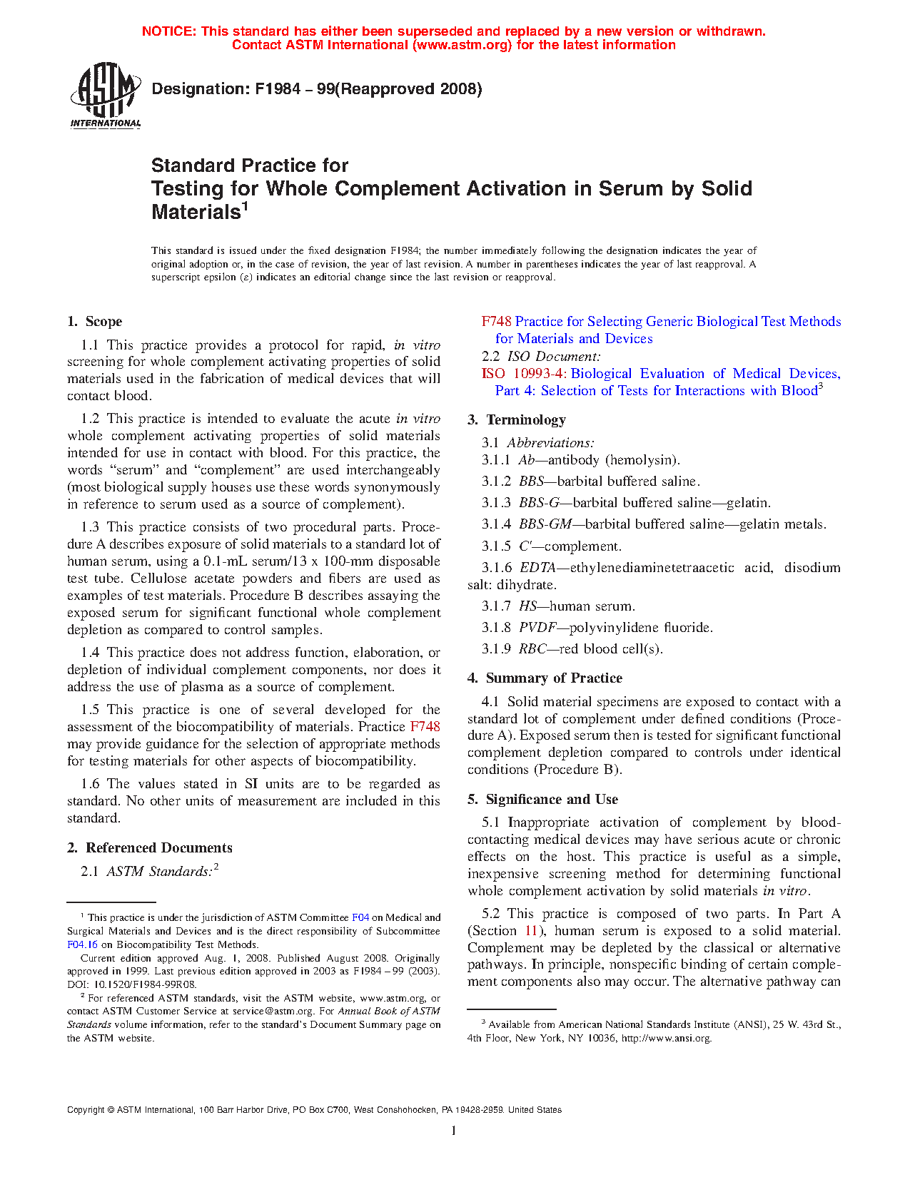 1.2 This practice is intended to evaluate the acute in vitro whole complement activating properties of solid materials intended for use in contact with blood. For this practice, the words “serum” and “complement” are used interchangeably (most biological supply houses use these words synonymously in reference to serum used as a source of complement).