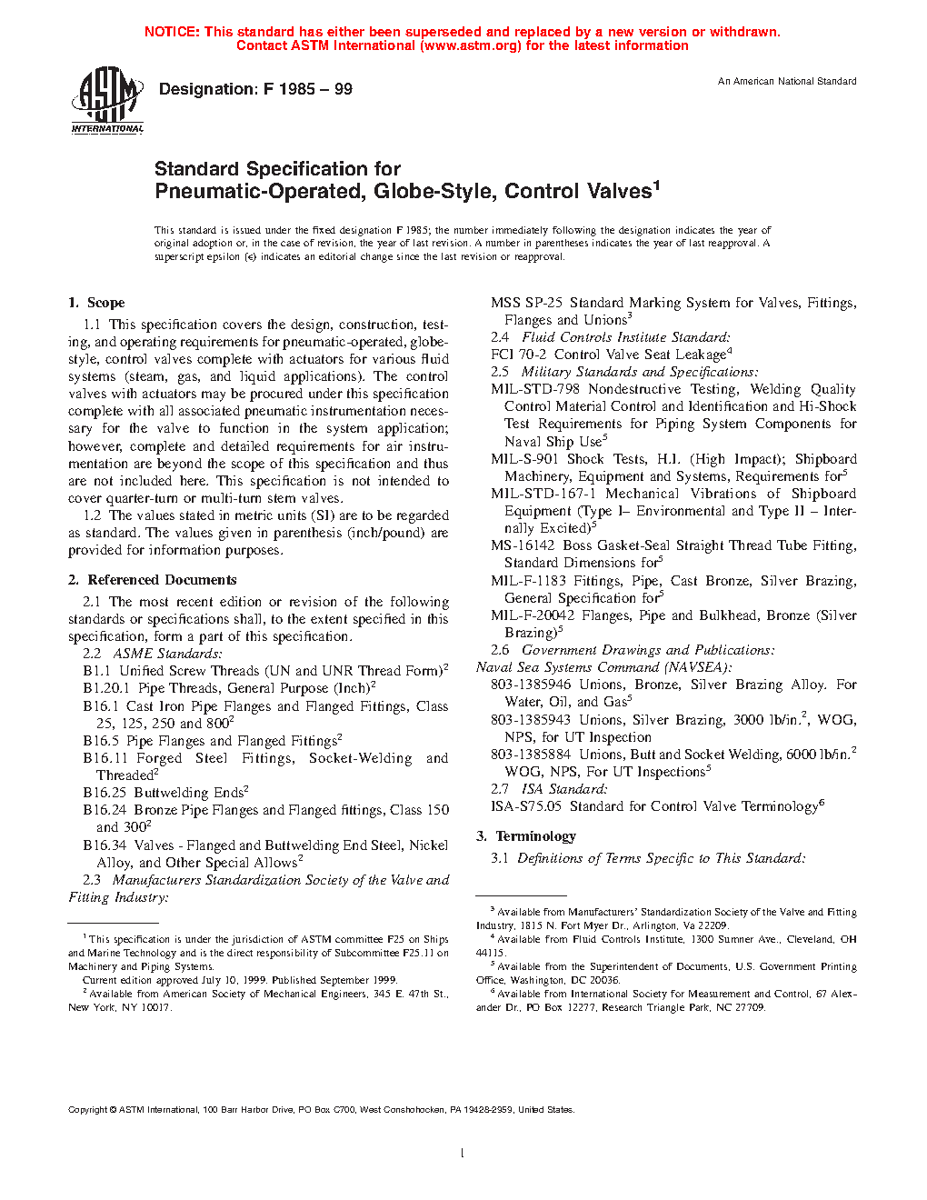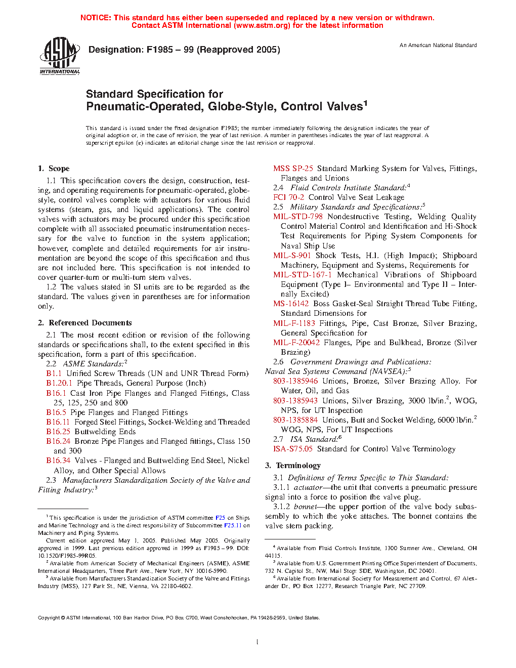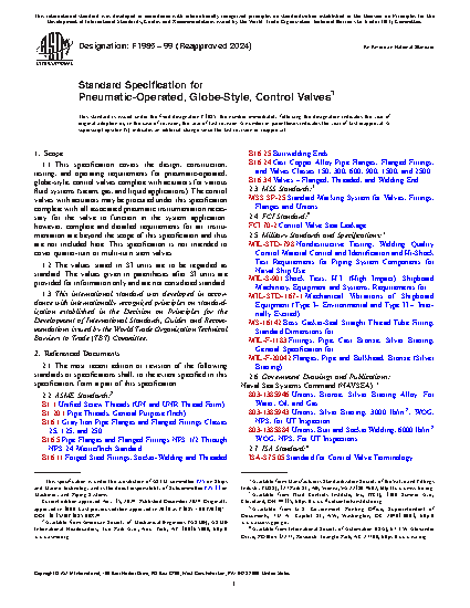 This specification covers the design, construction, testing, and operating requirements for pneumatic-operated, globe-style, control valves complete with actuators for various fluid systems (steam, gas, and liquid applications). The control valves with actuators may be procured under this specification complete with all associated pneumatic instrumentation necessary for the valve to function in the system application. Valves shall be of following material grades: Grade A; Grade B; Grade C; and Grade D. Valves shall be of following pressure rating types: Type 1; Type 2; Type 3; and Type 4. The inherent flow characteristics of the valve shall be specified as quick-opening, linear-opening, equal-percentage opening, or as specified. Visual examination, hydrostatic shell test, nondestructive examination, seat leakage test, and functional test shall be performed to conform with the specified requirements.