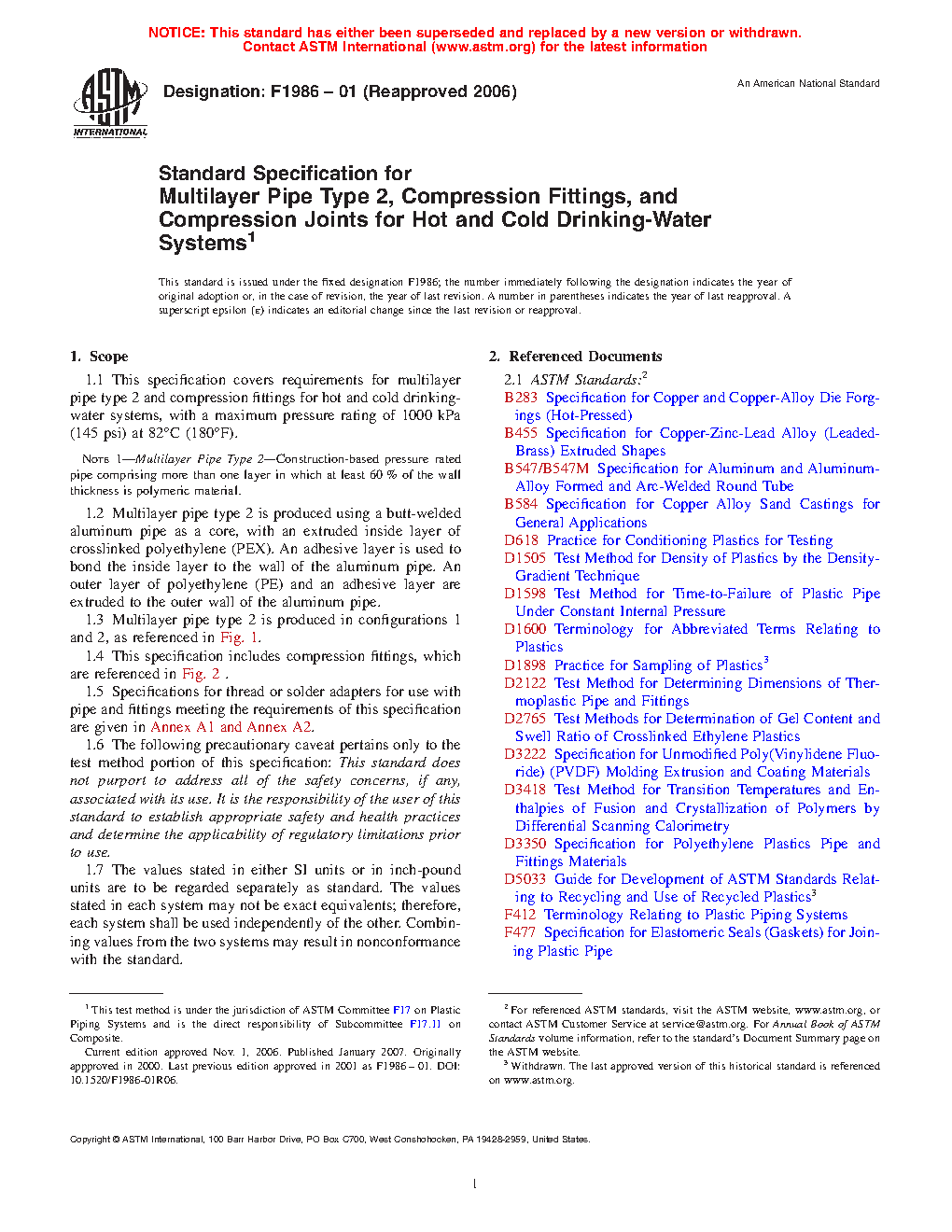 1.1 This specification covers requirements for multilayer pipe type 2 and compression fittings for hot and cold drinking-water systems, with a maximum pressure rating of 1000 kPa (145 psi) at 82°C (180°F).