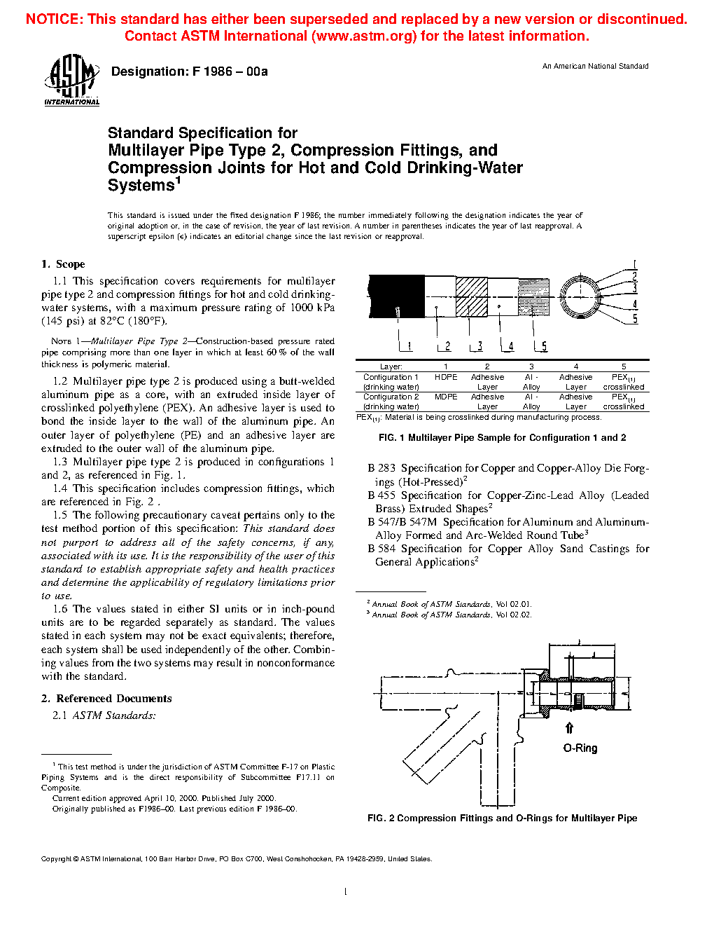 This specification covers requirements for multiplayer pipe type 2 and compression fittings for hot and cold drinking water systems. Multilayer pipe type 2 is produced using a butt-welded aluminum pipe as a core, with an extruded inside layer of crosslinked polyethylene (PEX). An adhesive layer is used to bond the inside layer to the wall of the aluminum pipe. An outer layer of polyethylene (PE) and an adhesive layer are extruded to the outer wall of the aluminum pipe. This specification includes compression fittings and thread or solder adapters for use with pipe and fittings. The pipe dimensions, compression-fitting dimensions, burst pressure, thermal cycling, and excessive temperature-pressure capability shall be in conformance to the specification.
