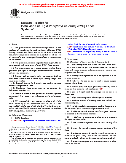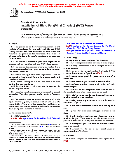 1.1 This practice covers the minimum requirement for and methods of installation for rigid poly(vinyl chloride) (PVC) fencing systems and fence accessories in areas where the maximum frost penetration does not exceed 30 in. (76 cm). In all cases, refer also to the specific manufacturer's instructions for installation.