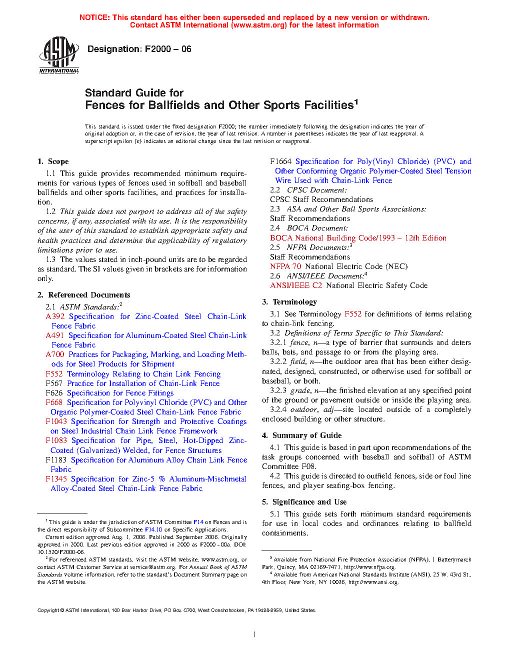 1.1 This specification provides recommended minimum requirements for various types of fences used in softball and baseball ballfields and other sports facilities, and practices for installation.
