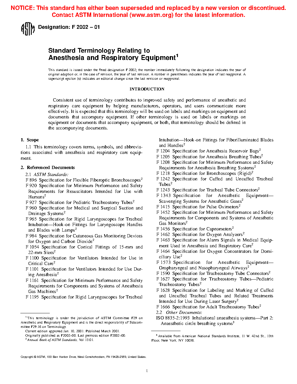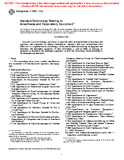 Standard Terminology Relating to Anesthesia and Respiratory Equipment (Withdrawn 2002)