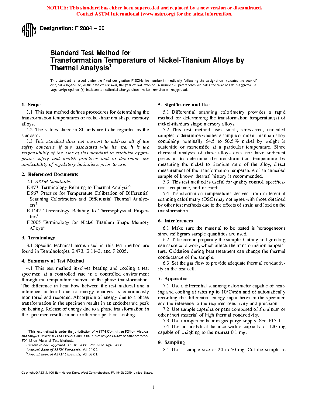 5.4 Transformation temperatures derived from differential scanning calorimetry (DSC) may not agree with those obtained by other test methods due to the effects of strain and load on the transformation. For example, transformation temperatures measured in accordance with Test Method F2082 will differ from those measured by the current standard.