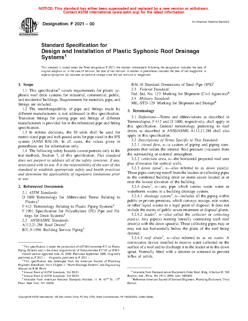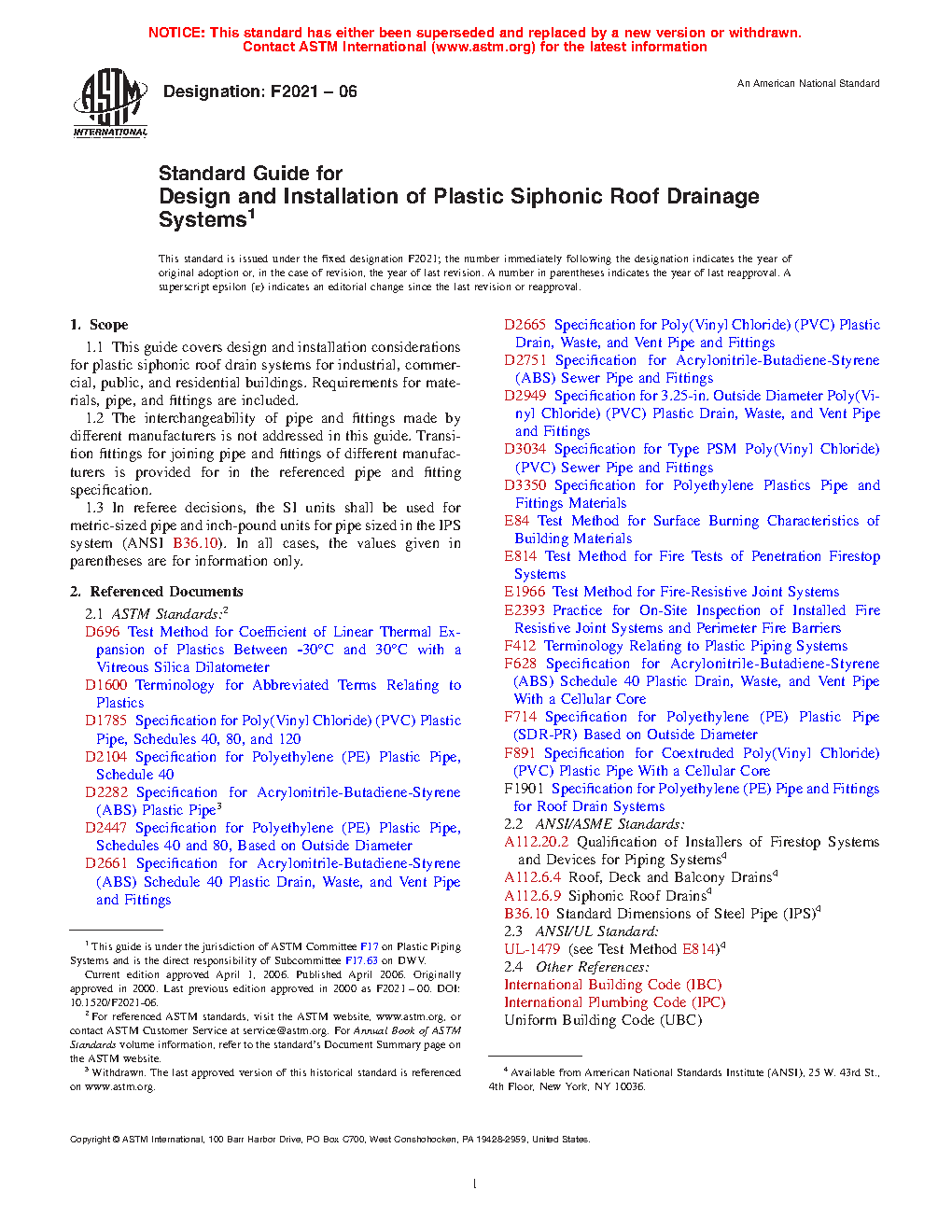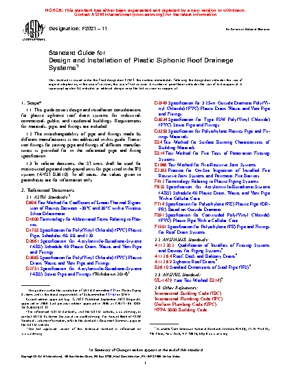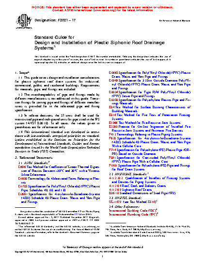 1.1 This guide covers design and installation considerations for plastic siphonic roof drain systems for industrial, commercial, public, and residential buildings. Requirements for materials, pipe, and fittings are included.