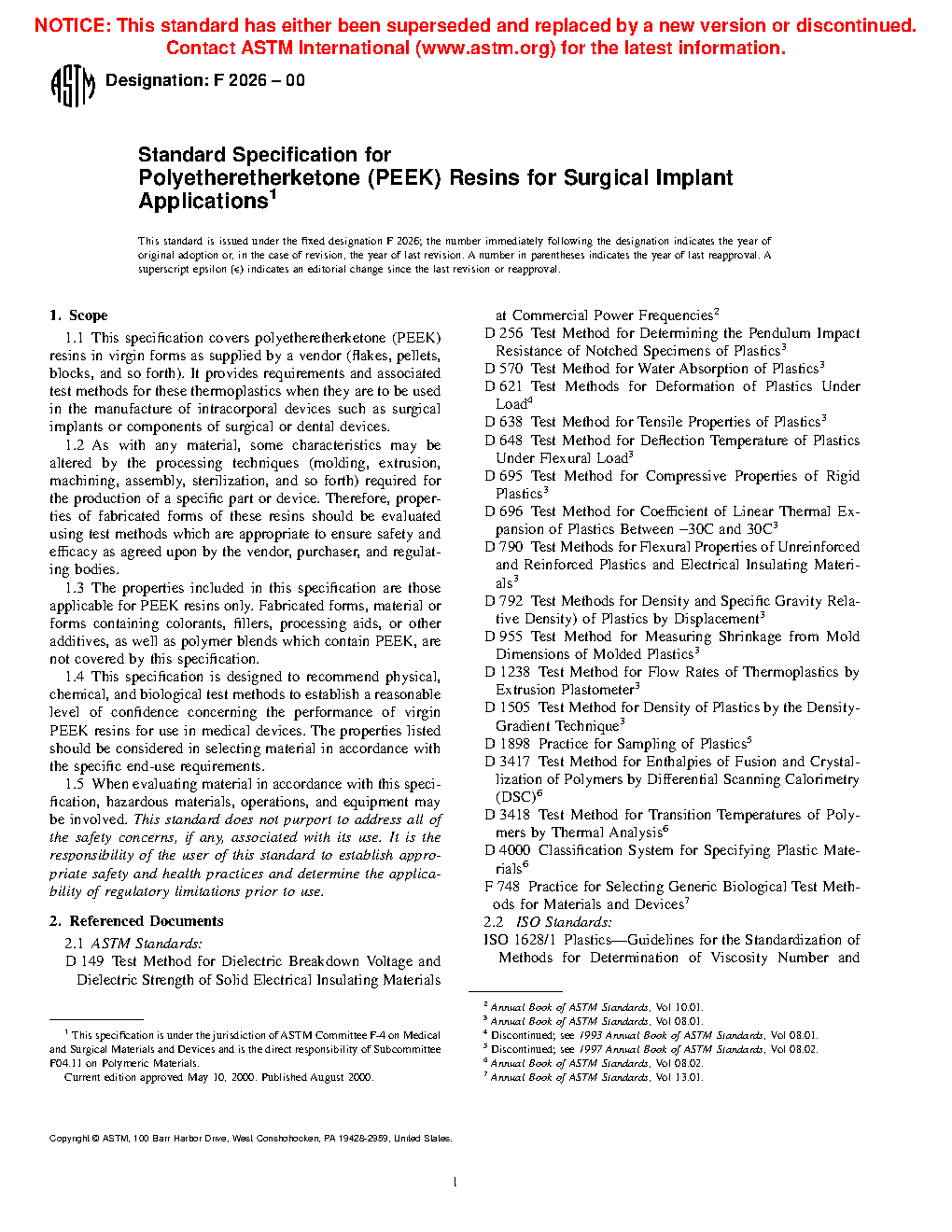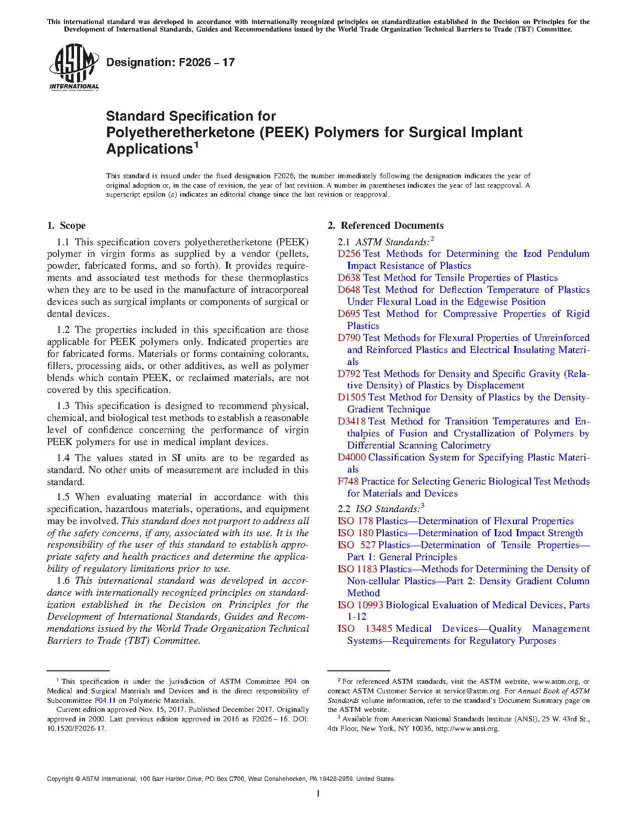 1.4 This specification is designed to recommend physical, chemical, and biological test methods to establish a reasonable level of confidence concerning the performance of virgin PEEK polymers for use in medical implant devices. The properties listed should be considered in selecting material in accordance with the specific end-use requirements.
