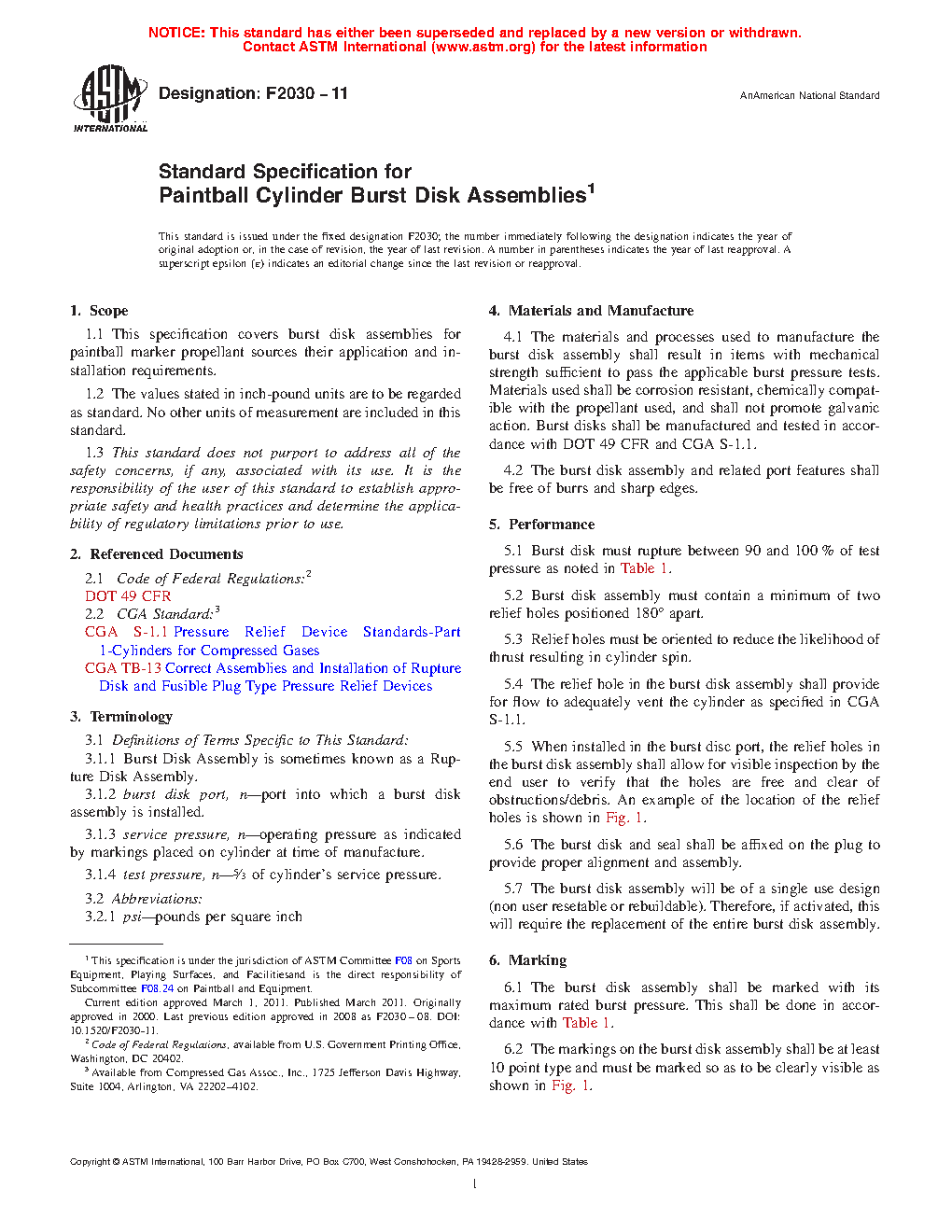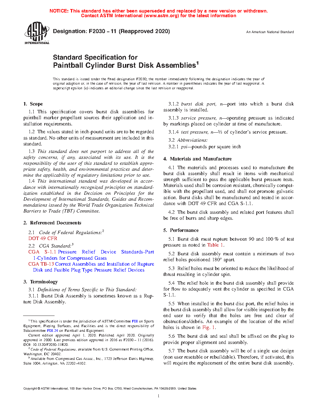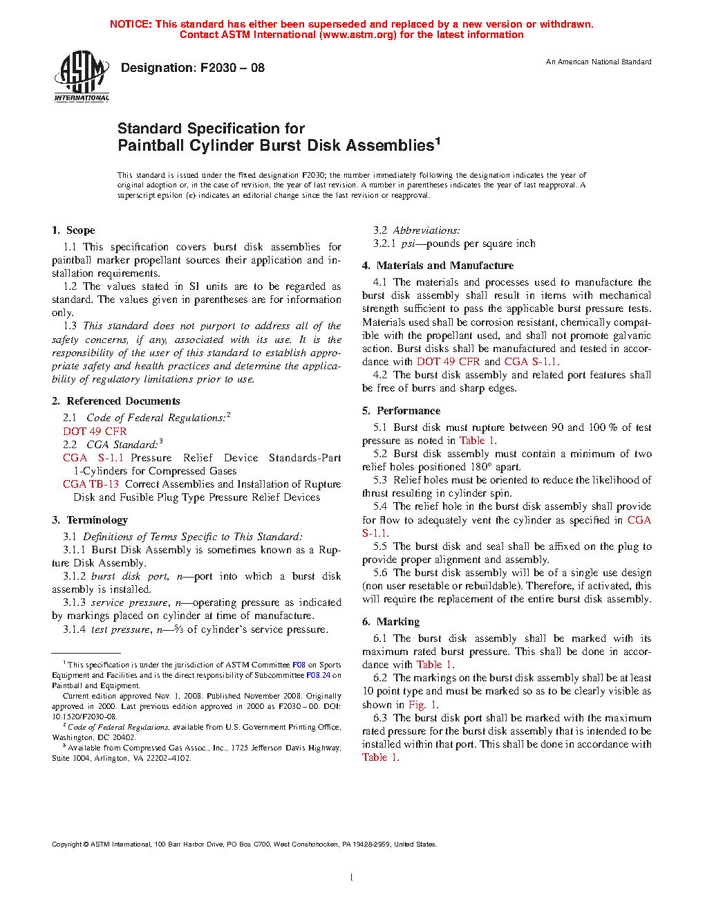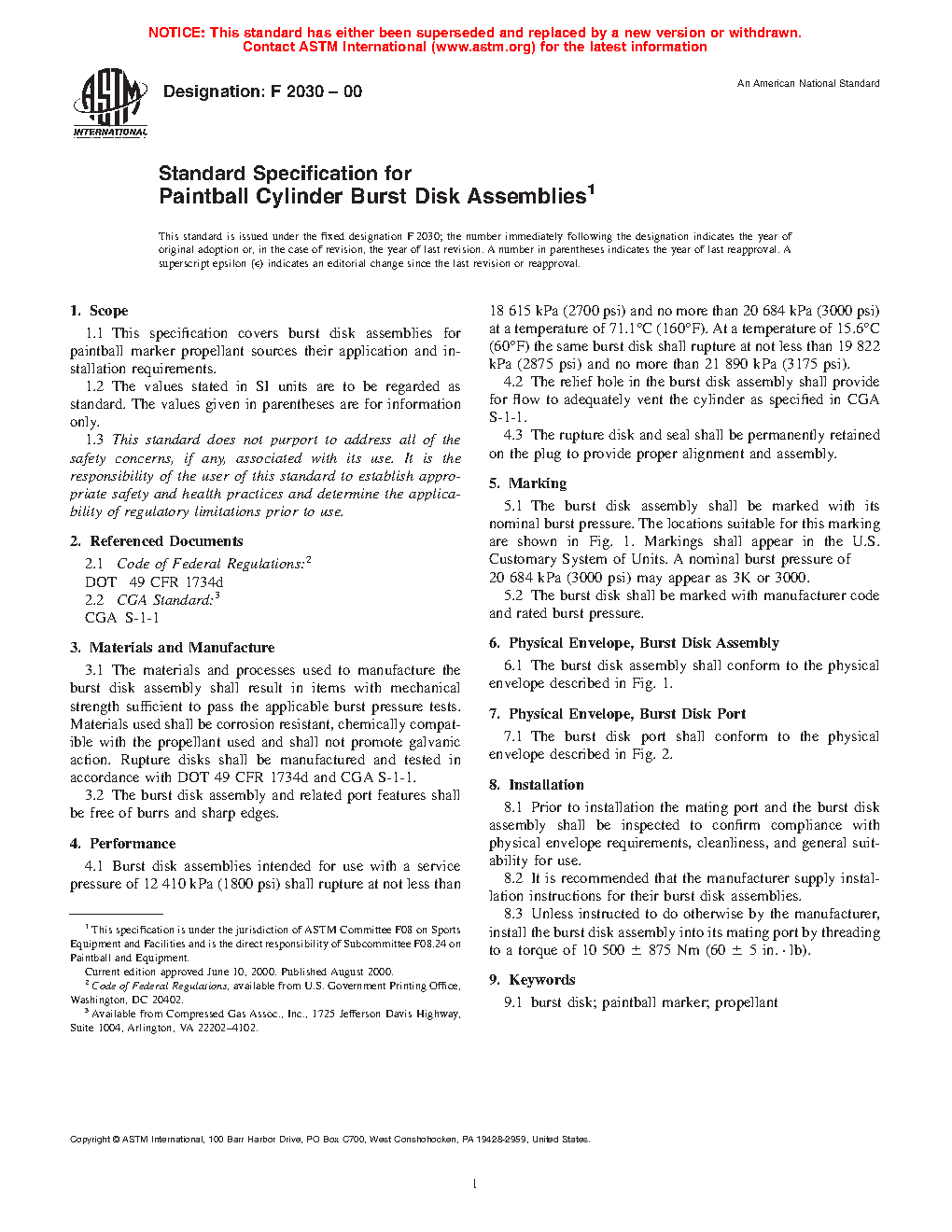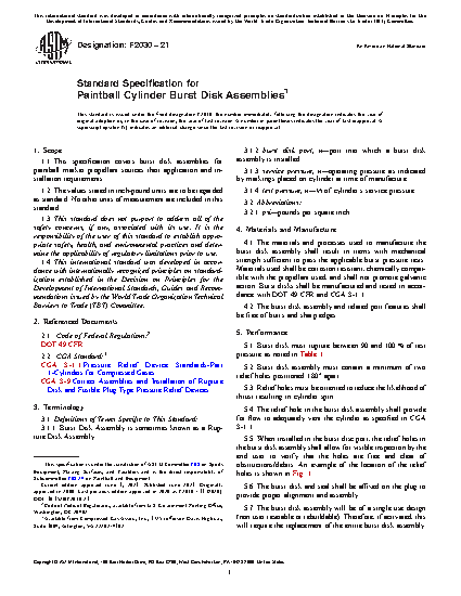 1.1 This specification covers burst disk assemblies for paintball marker propellant sources their application and installation requirements.