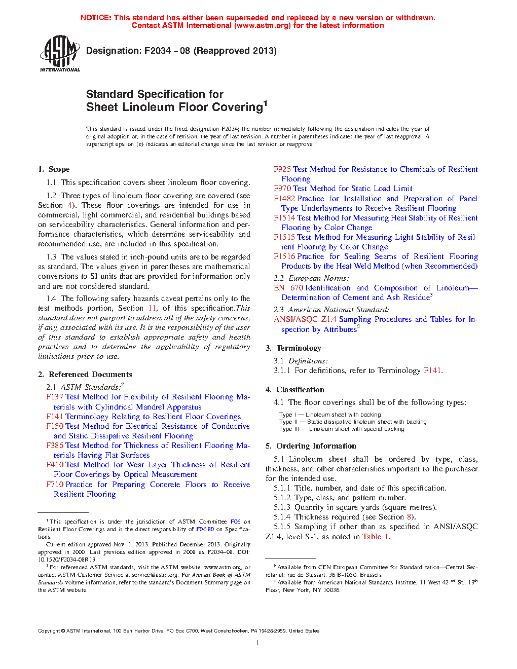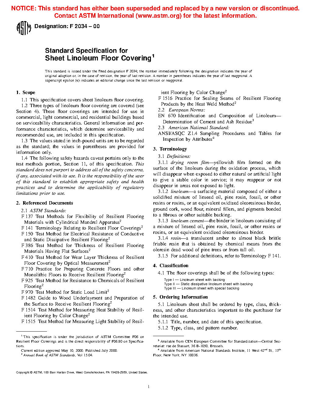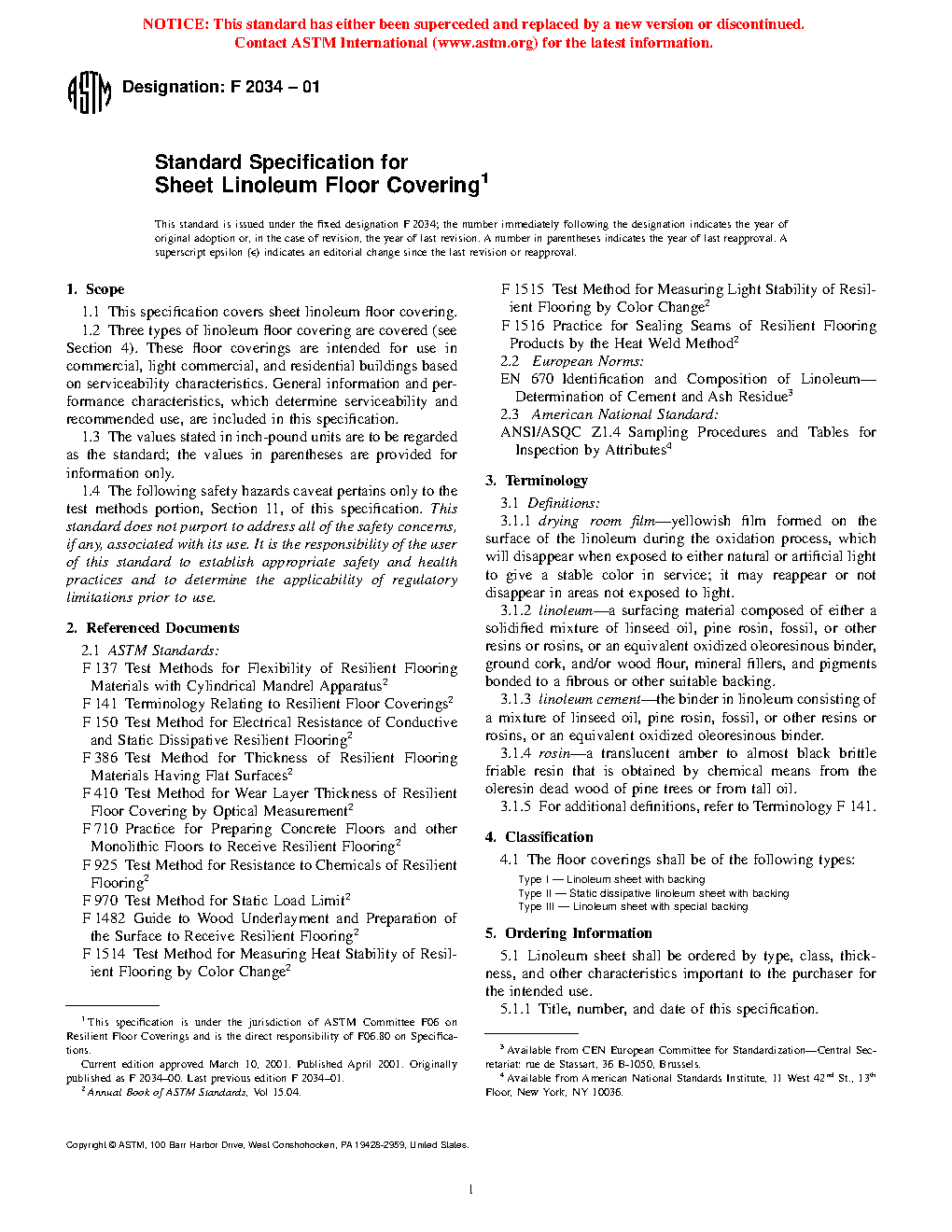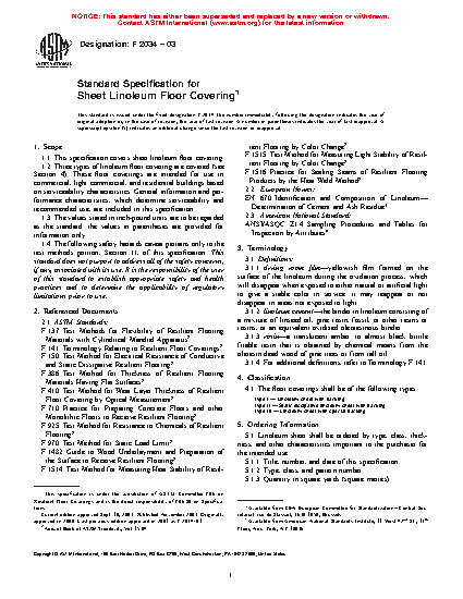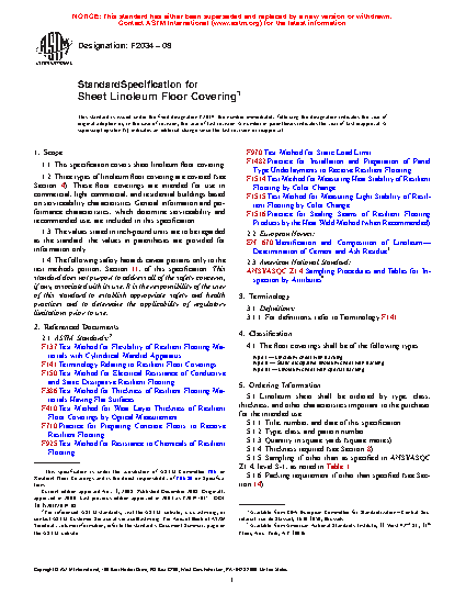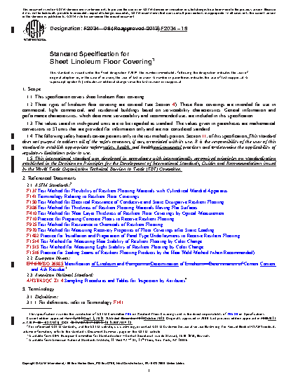1.2 Three types of linoleum floor covering are covered (see Section 4). These floor coverings are intended for use in commercial, light commercial, and residential buildings based on serviceability characteristics. General information and performance characteristics, which determine serviceability and recommended use, are included in this specification.