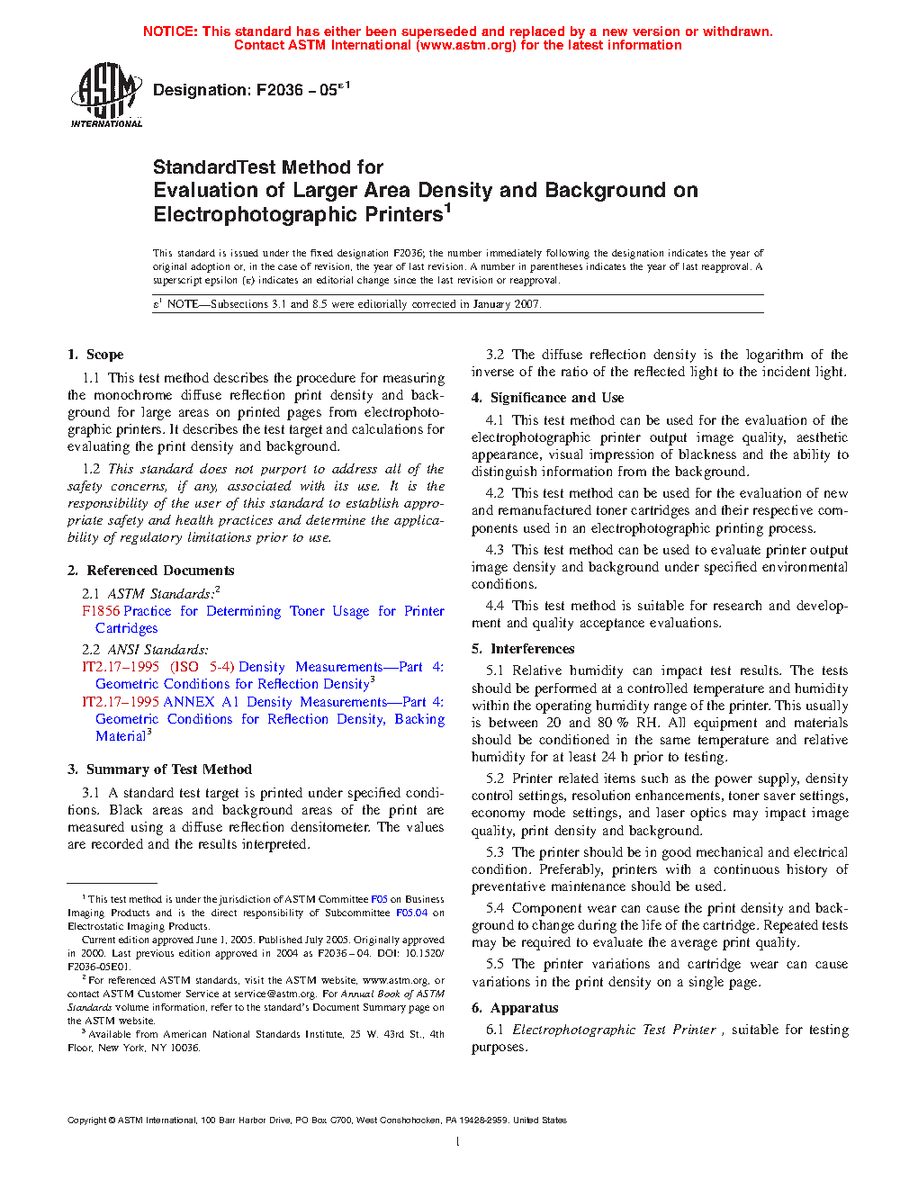 1.1 This test method describes the procedure for measuring the monochrome diffuse reflection print density and background for large areas on printed pages from electrophotographic printers. It describes the test target and calculations for evaluating the print density and background.